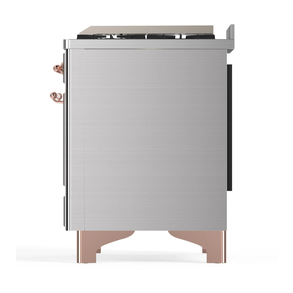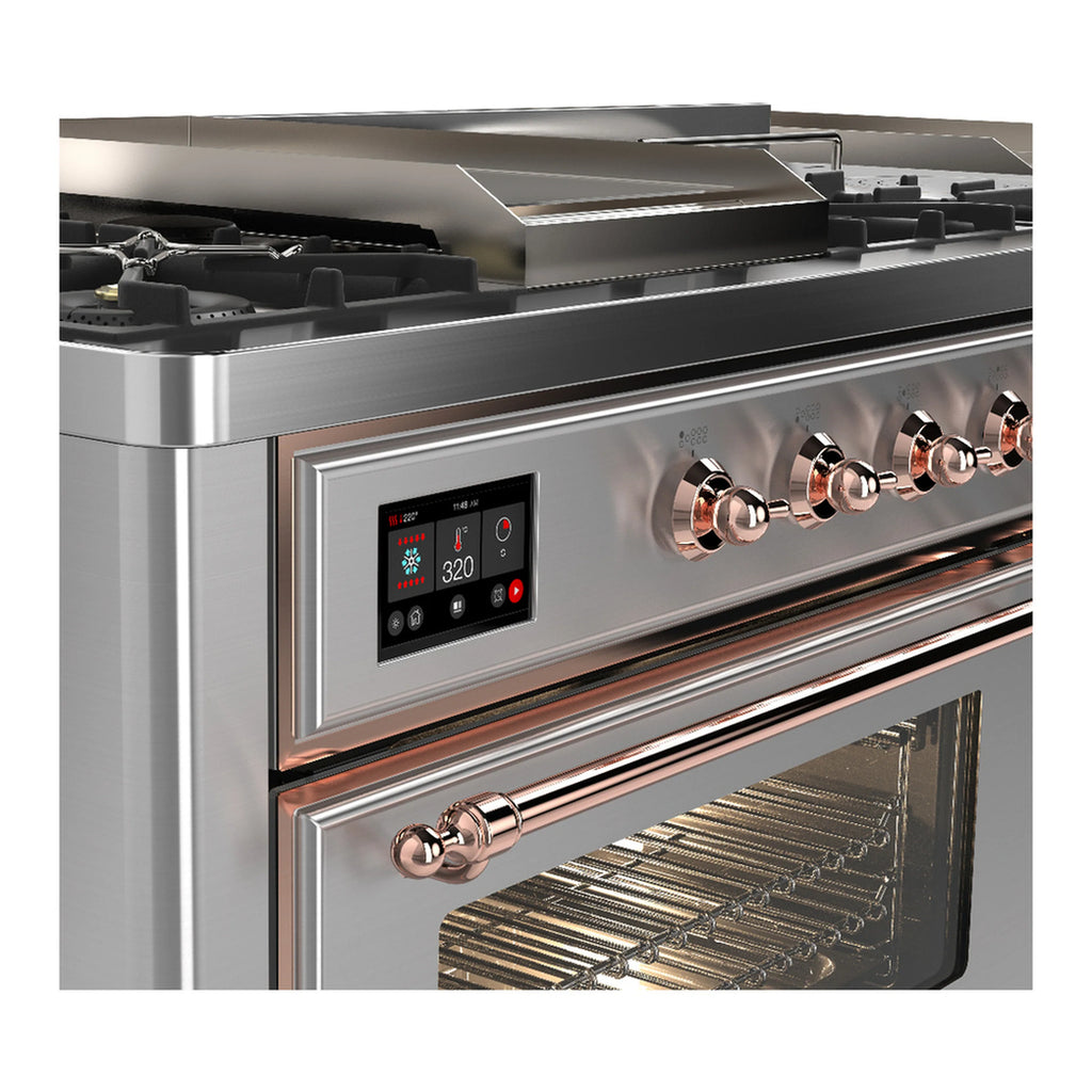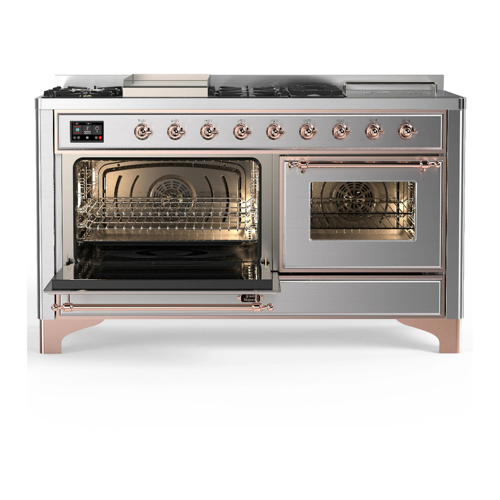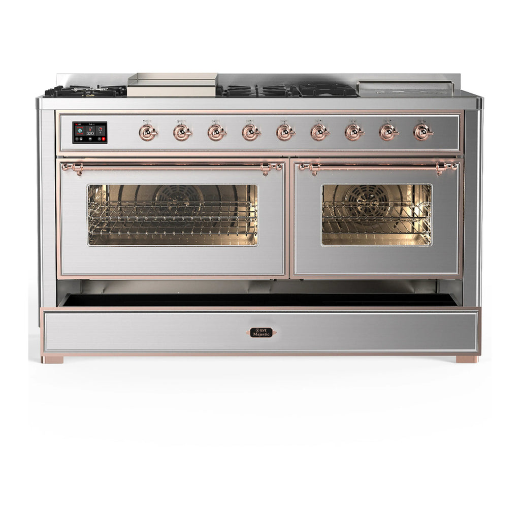 ILVE Majestic III 60-inch Dual Fuel Range with 5 Liquid Propane Burner, Griddle, French Top and Triple Glass Door Electric Oven in Stainless Steel with Copper Trim (UM60FSNR3SSPLP)