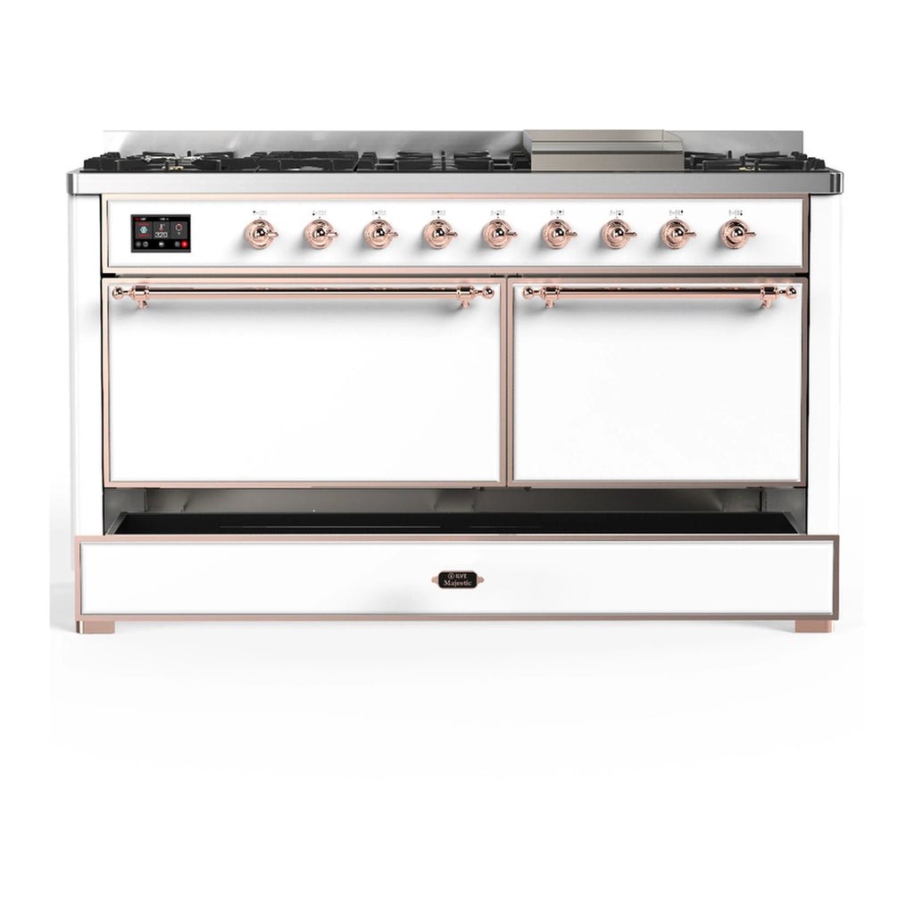 ILVE Majestic III 60-inch Dual Fuel Range with 5 Liquid Propane Burner, Griddle and Solid Door Electric Oven in White with Copper Trim (UM60FQNR3WHPLP)