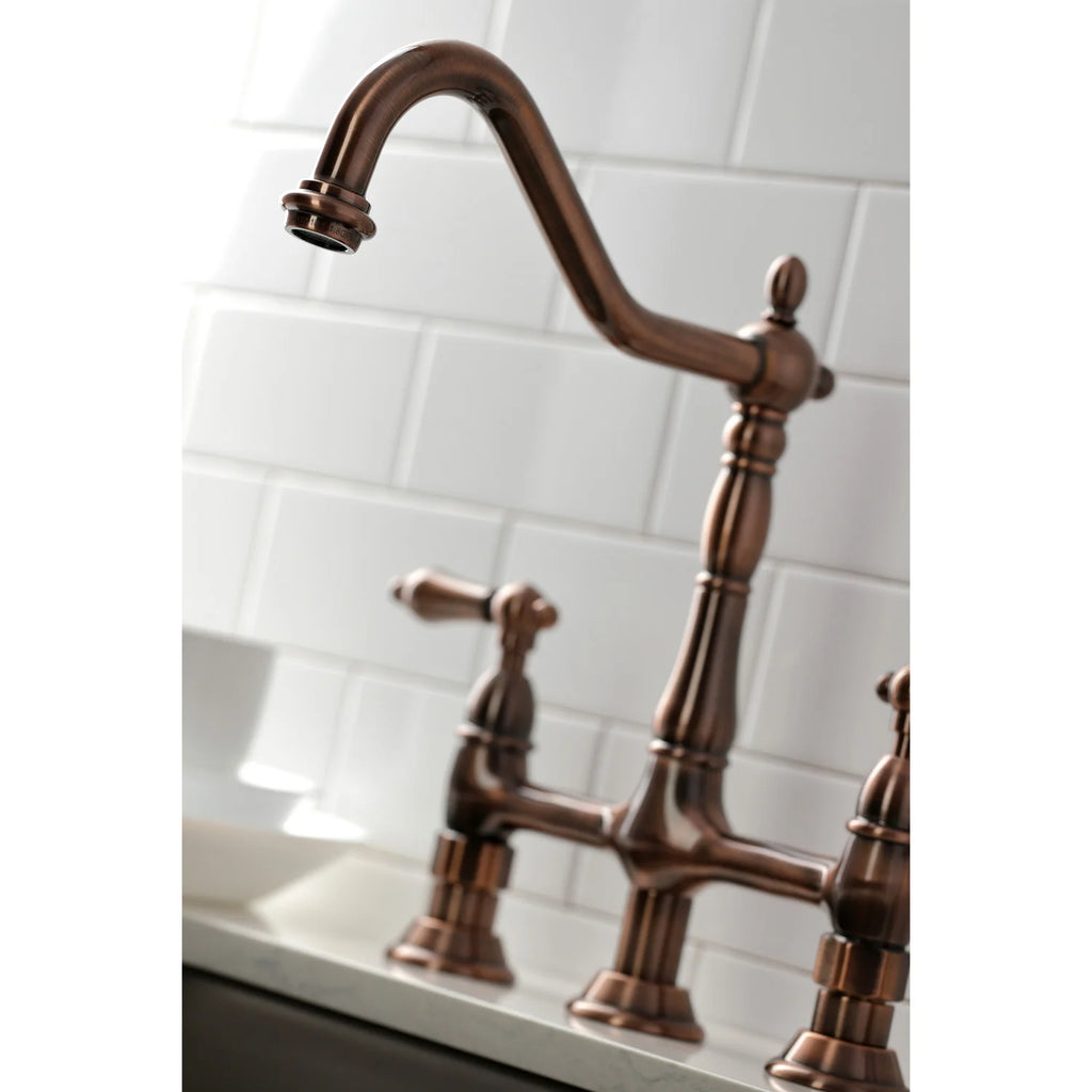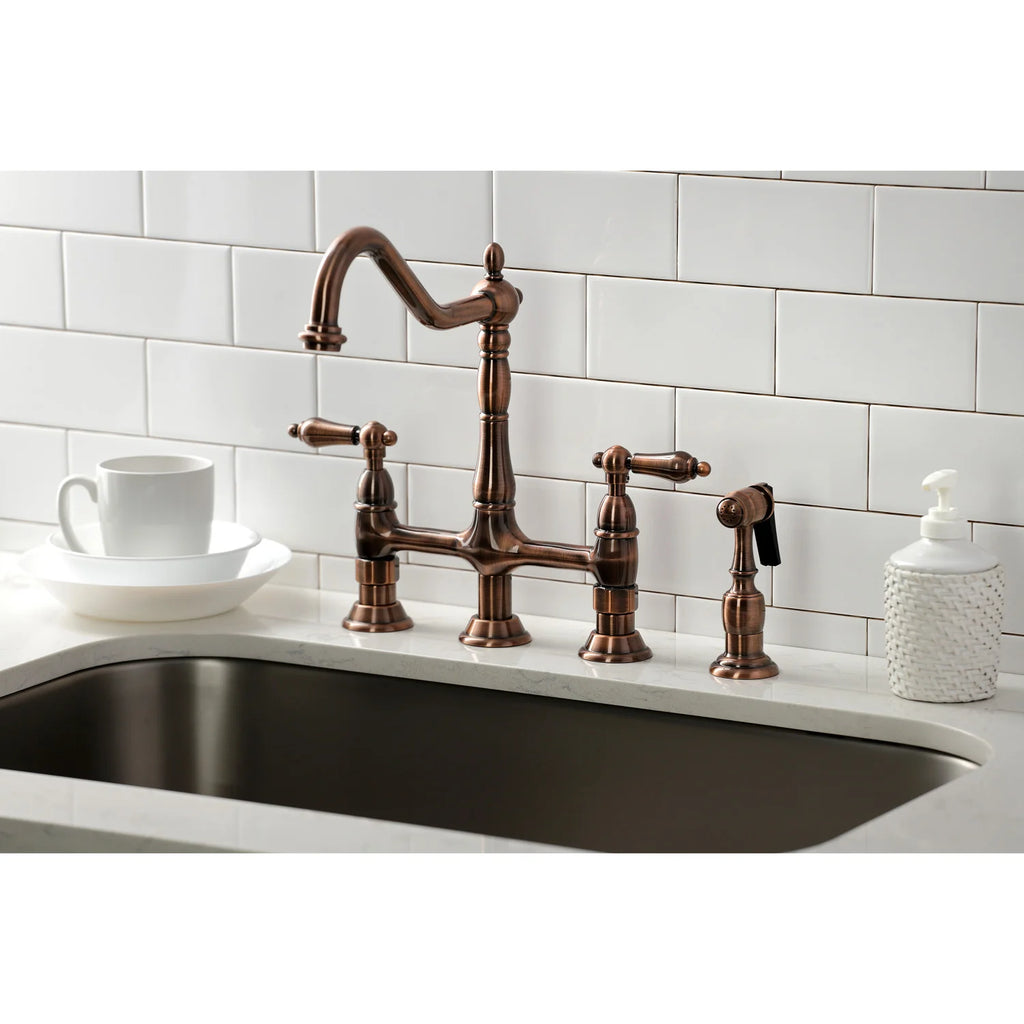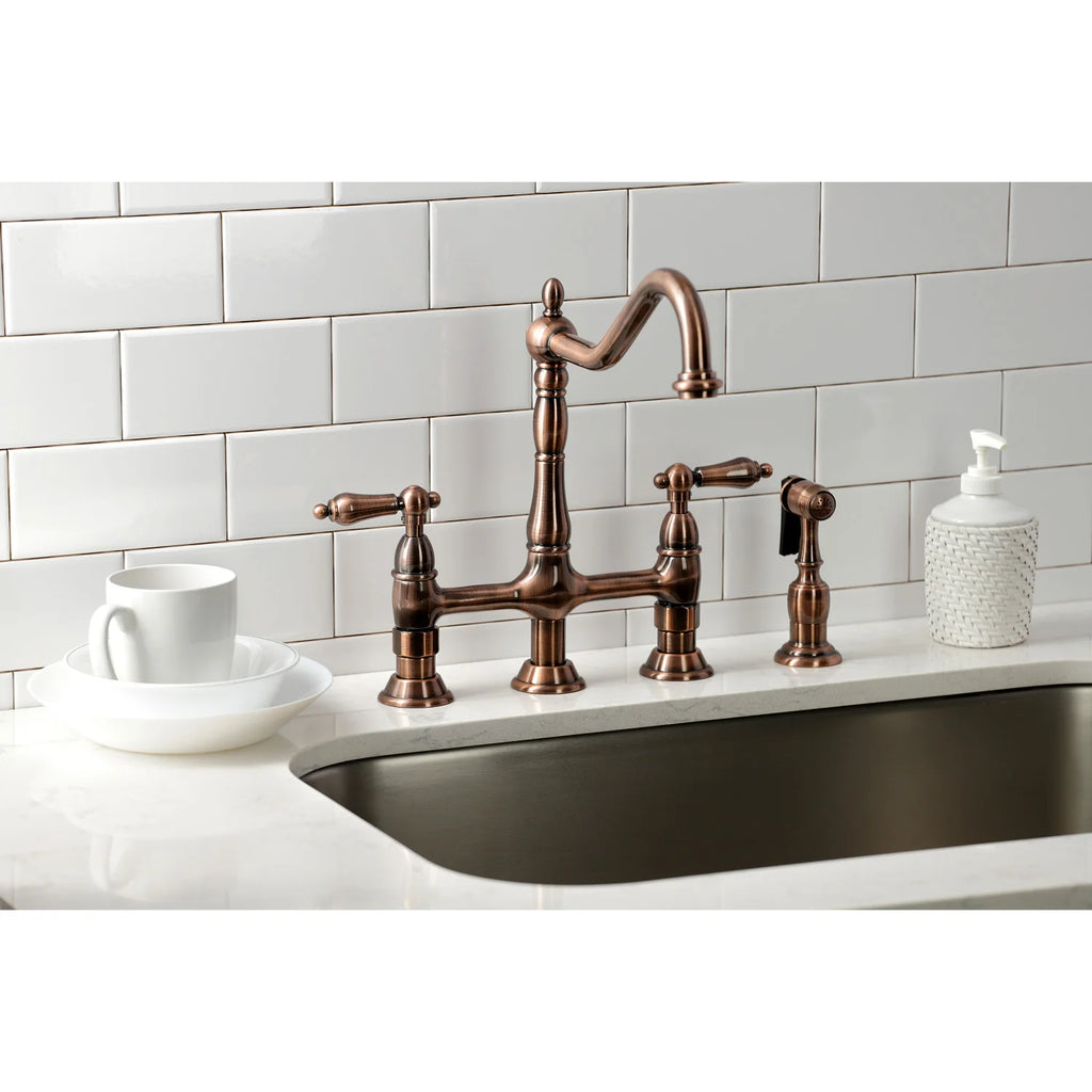 A lavish spark of traditionally stylized glamour is brought to your kitchen ensemble with this beautiful faucet. Whether you are striving for a Victorian-inspired kitchen or a vibrant 1950s-themed space, the unique bridge design is a highly favored option amongst those doing period-style kitchens. Because of its added architectural elements and detailing, the premium antique copper finish will pop against your surrounding kitchen decor. Allow the brass construction, side sprayer, and swivel abilities to provide a sturdy and reliant fixture, great for use with any sink.