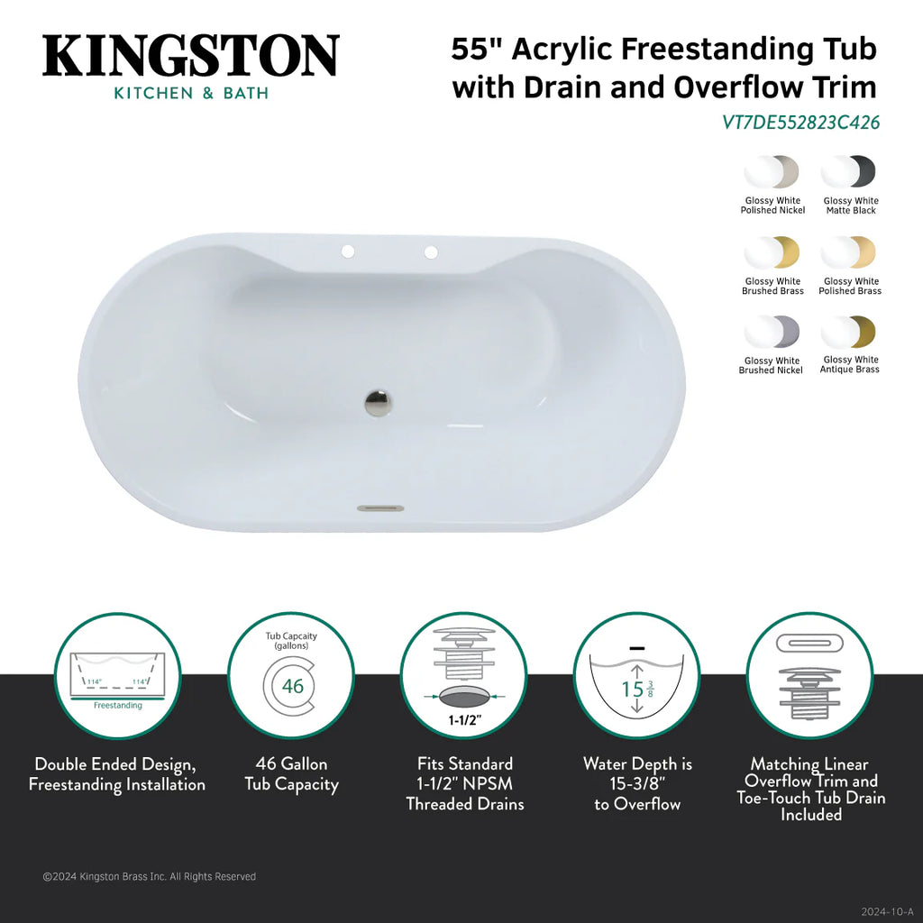 Transform your bathroom’s contemporary decor with the luxurious comfort of a Kingston Brass freestanding bathtub. Featuring a clean, modern, and minimalist design, this tub includes an integral faucet deck, predrilled at 7” center to center for easy installation, eliminating the need for extra space for a freestanding faucet. Despite its compact 55-inch size, its ergonomic design and extra depth offer a delightful spa-like experience. Crafted from durable, scratch-resistant acrylic, this tub will enhance your home’s beauty for years to come. The elegant glossy finish on both the interior and exterior adds a touch of high design to your space. This freestanding bathtub is the perfect choice for those seeking luxury and functionality in their bathroom.