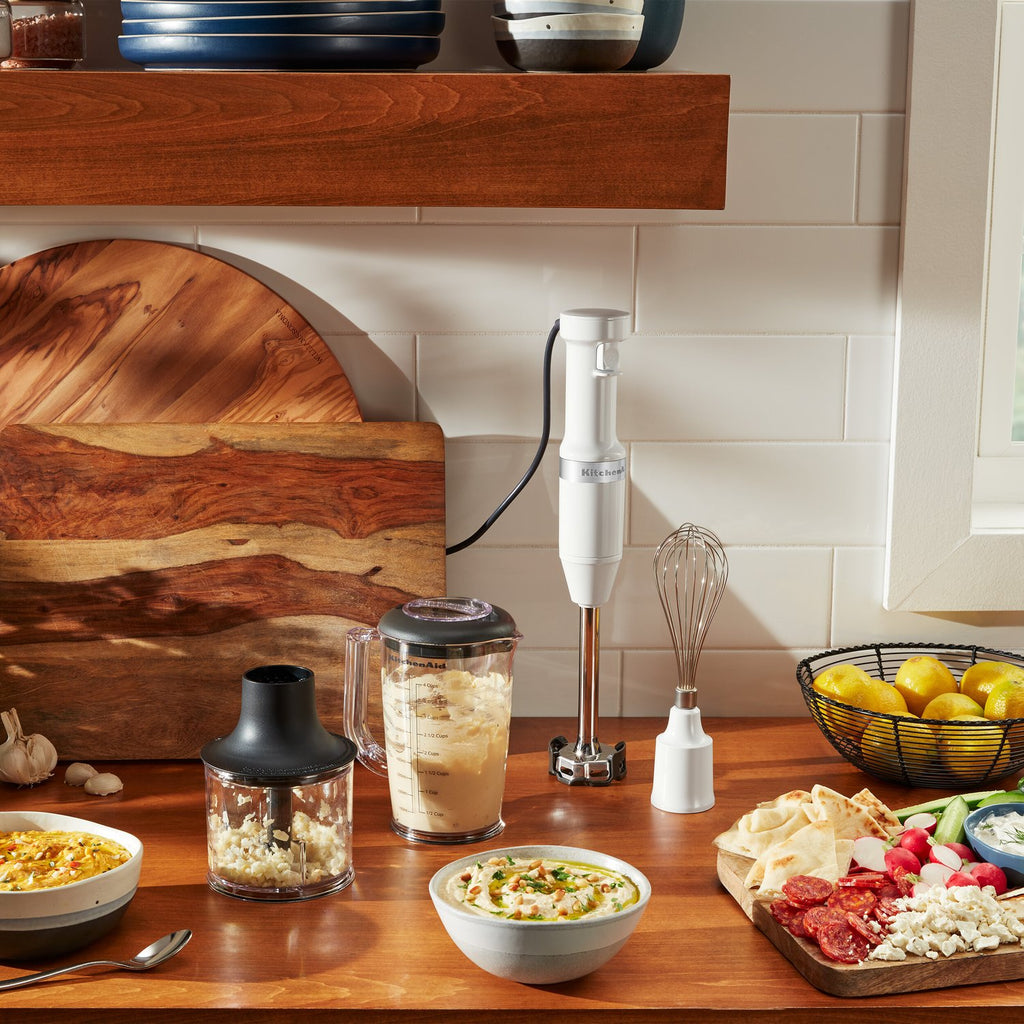 The KitchenAid Variable Speed Corded Immersion Blender delivers versatile, everyday power for your kitchen, combining blending, whipping, and chopping capabilities into one compact, corded immersion tool. At its core is a detachable 8″ stainless steel blending arm with a four-point blade that quickly and efficiently purées smoothies, soups, sauces, dips, and more, allowing you to work directly in pots or bowls without extra appliances. The variable speed trigger gives you intuitive control over texture and consistency, so you can smoothly transition from light mixing to full-strength blending as your recipe demands. This model comes with thoughtfully designed accessories that expand its usefulness: a whisk attachment for whipping creams or emulsifying dressings and a BPA-free chopper attachment that makes quick work of herbs, nuts, cheese, and small ingredients. A 4-cup BPA-free blending pitcher with a lid supports measured prep and easy storage, while the included pan guard helps protect your cookware during immersion blending. Detachable parts are dishwasher-safe for quick cleanup, and the corded design ensures continuous power for extended tasks. Whether you’re making weekend soups, whipping up sauces, or multitasking with chops and blends, this complete hand blender set streamlines prep and delivers consistent, dependable performance.
