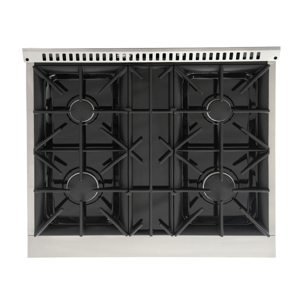 This 30" Freestanding Gas Range by Kucht offers 4 sealed burners and a 4.2 cu. ft. capacity oven. The range features manual convection cooking mode, tube burner broiler, blue porcelain oven interior and black porcelain top. Available at Home Outlet Direct