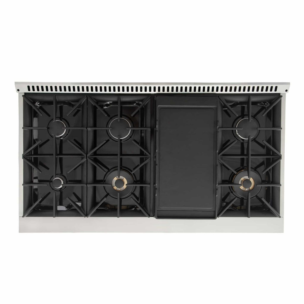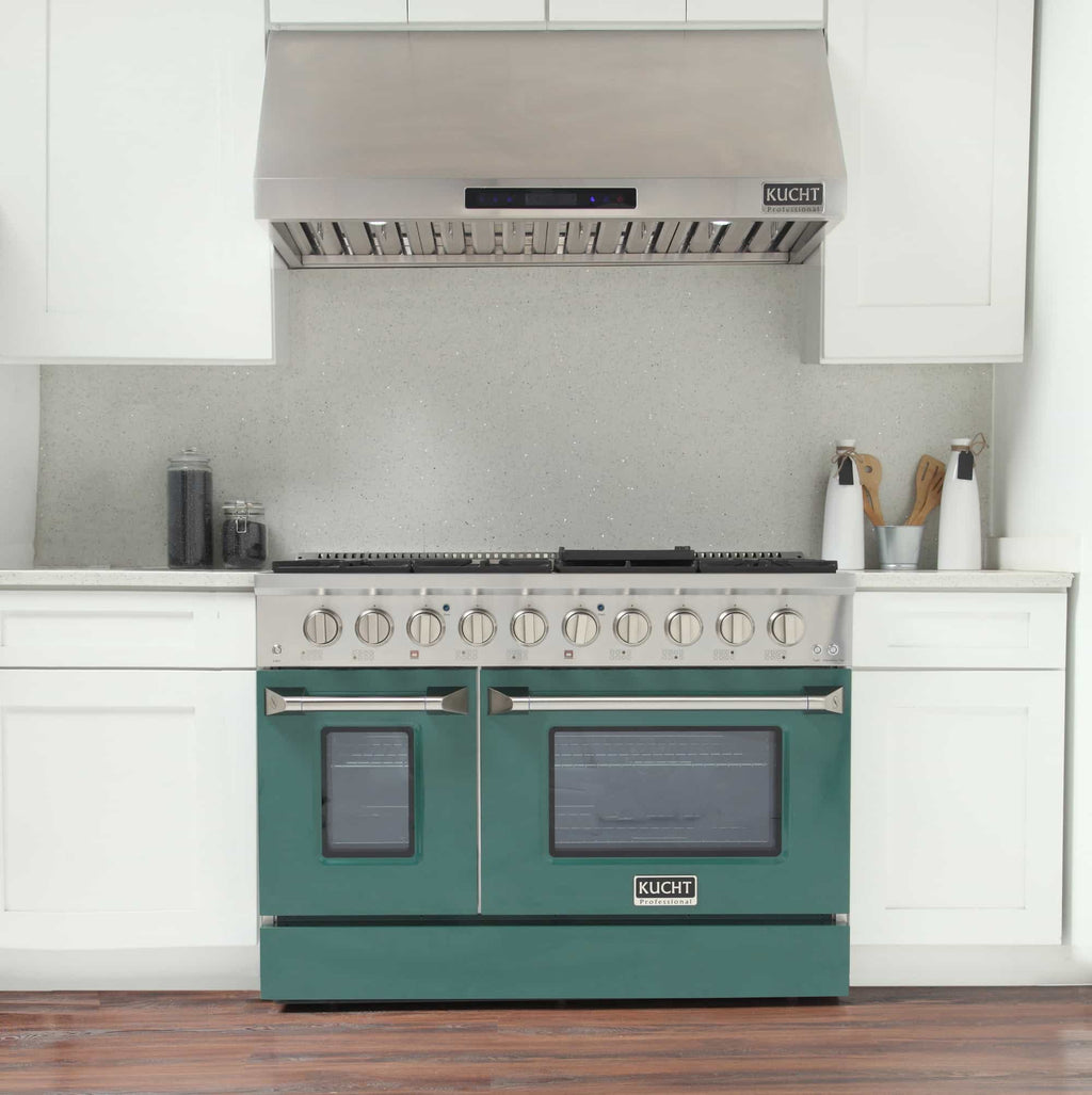 KUCHT Professional 48 in. 6.7 cu. ft. Range with Sealed Burners, Griddle/Grill and Two Ovens - One Convection - in Stainless Steel with Green Oven Doors