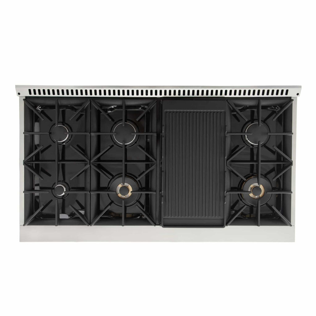 KUCHT Professional 48 in. 6.7 cu. ft. Range with Sealed Burners, Griddle/Grill and Two Ovens - One Convection - in Stainless Steel with Red Oven Doors