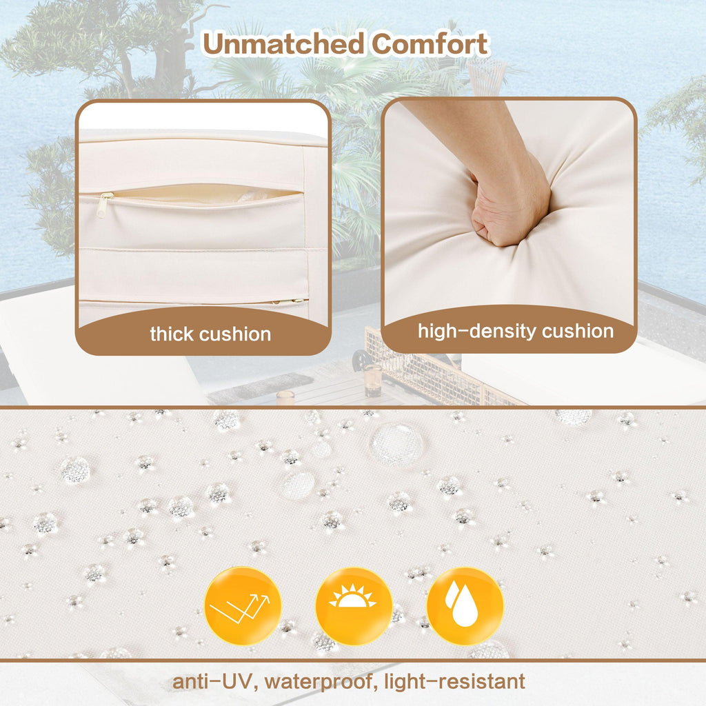 Superior Quality and Durability: Constructed with a reinforced rattan frame featuring multiple horizontal and vertical iron bars, this outdoor lounge chair offers exceptional stability and strength. Also the adjustable foot pads can provide the stability. The high-density, high-resilience sponge cushion provides long-lasting comfort, while the weather-resistant fabric treated with anti-UV, waterproof, and light-resistant technology ensures it withstands the elements for years to come.