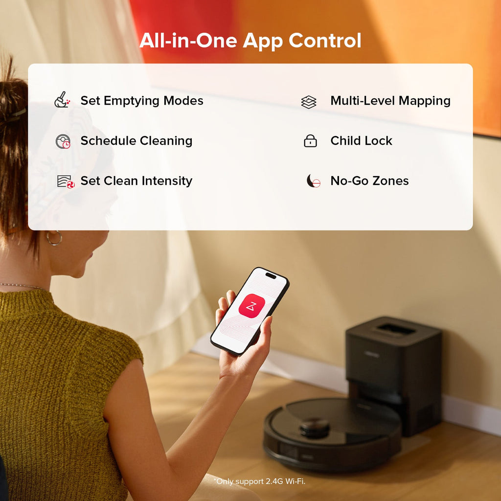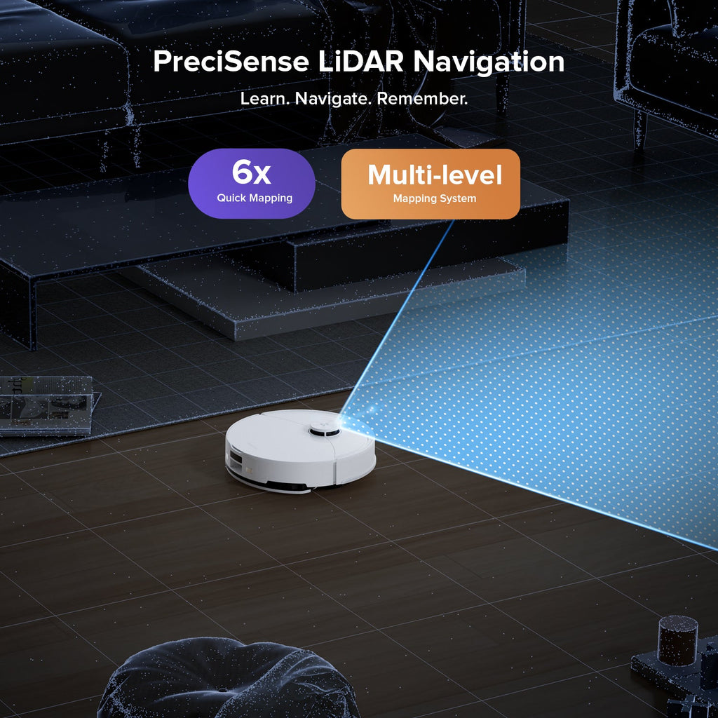 PreciSense LiDAR + Reactive Tech Obstacle Avoidance: Accurate mapping (360° LiDAR), multi-floor support, and sensors to help detect and avoid obstacles in the home.