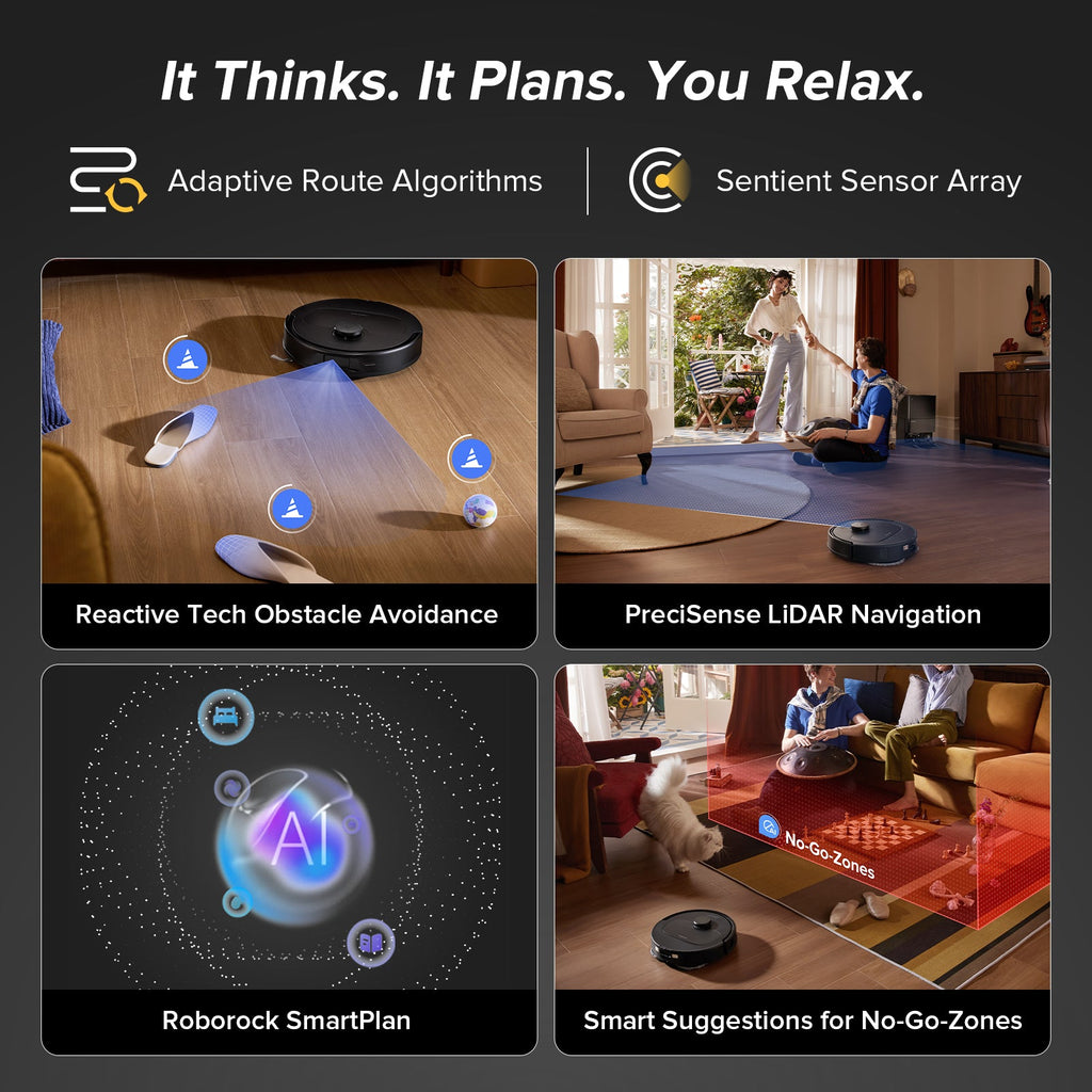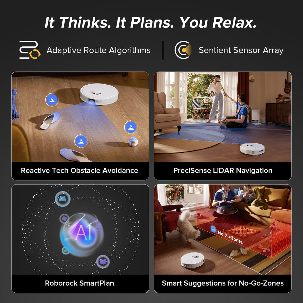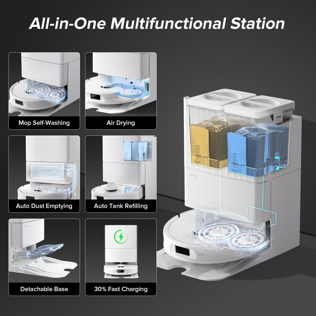 The Roborock QV 35A5-M2 is a high-convenience robot vacuum & mop system designed to simplify floor cleaning in larger homes. With powerful 8,000 Pa HyperForce suction, it tackles embedded dirt, pet hair, and debris with strong extraction, while the dual spinning mop pads help scrub hard floors effectively. The robot is paired with an All-in-One Station dock that handles many maintenance tasks: auto dustbin emptying, mop-self-washing, cold-air drying, and auto tank refilling. Reactive Tech obstacle avoidance and PreciSense LiDAR navigation help it move intelligently around furniture, cords, and clutter. It also includes features like auto mop lifting when encountering carpet, app control with scheduling, and support for voice assistants.