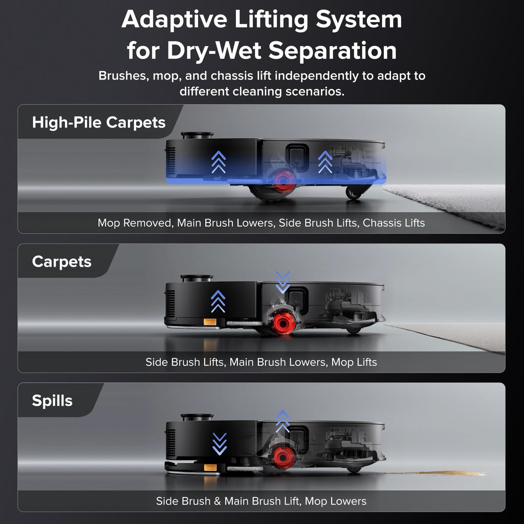 High-Performance Suction & Mop Combo: Strong suction power paired with dual spinning mop pads (plus mop lift when crossing carpets) for both dry debris and wet messes.