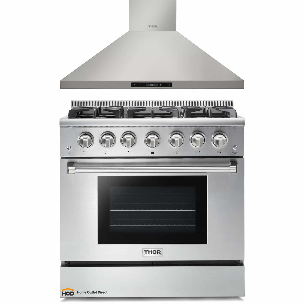 Thor Kitchen 2-Piece Pro Appliance Package - 36-Inch Propane Gas Range & Premium Wall Mount Hood in Stainless Steel