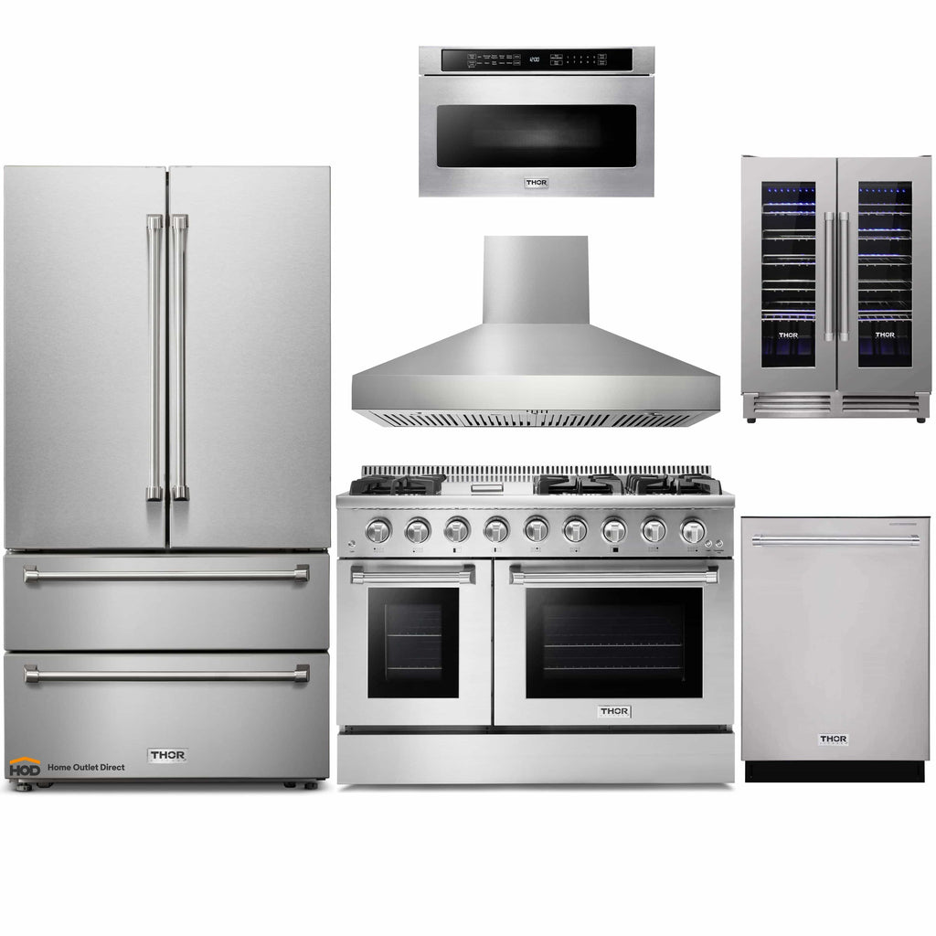Thor Kitchen 6-Piece Pro Appliance Package - 48-Inch Propane Gas Range, French Door Refrigerator, Dishwasher, Pro Wall Mount Hood, Microwave Drawer, & Wine Cooler in Stainless Steel