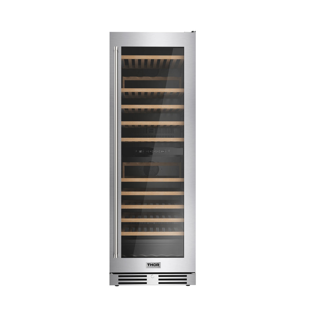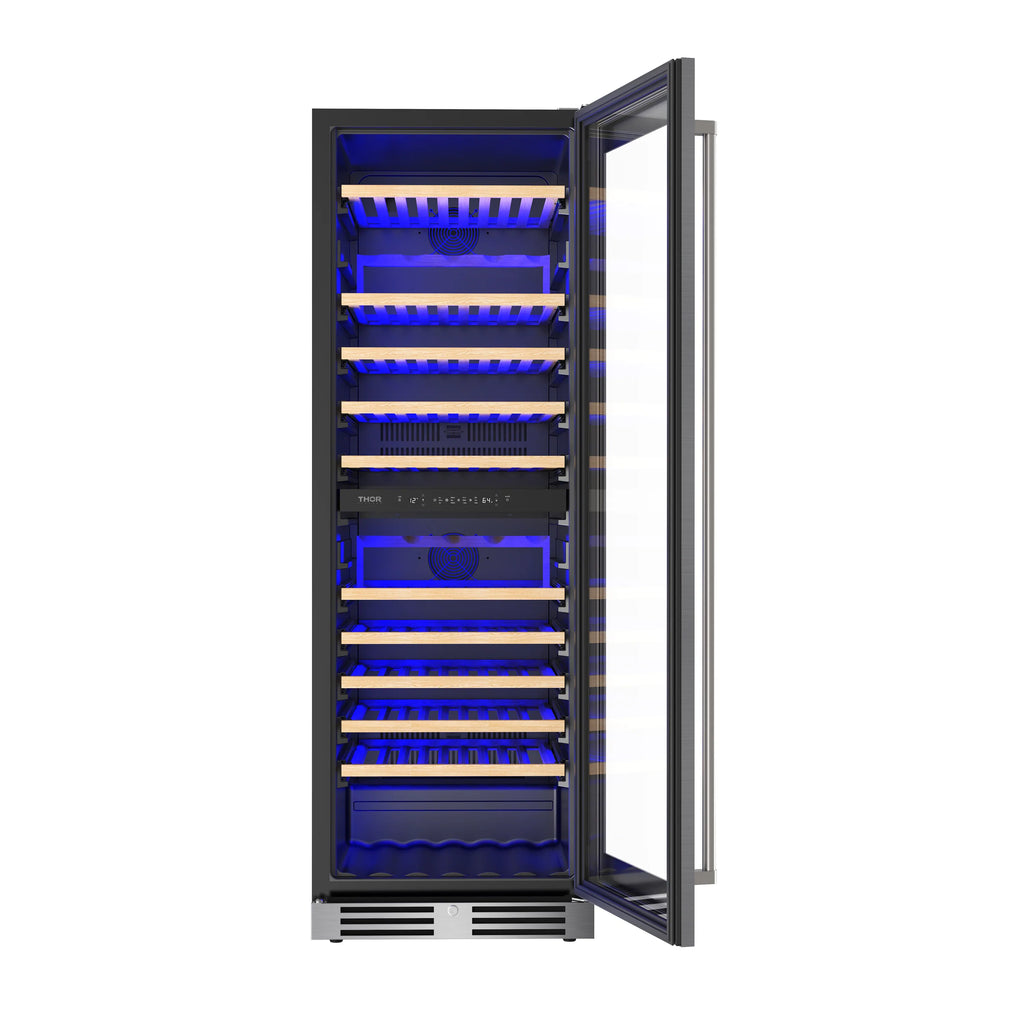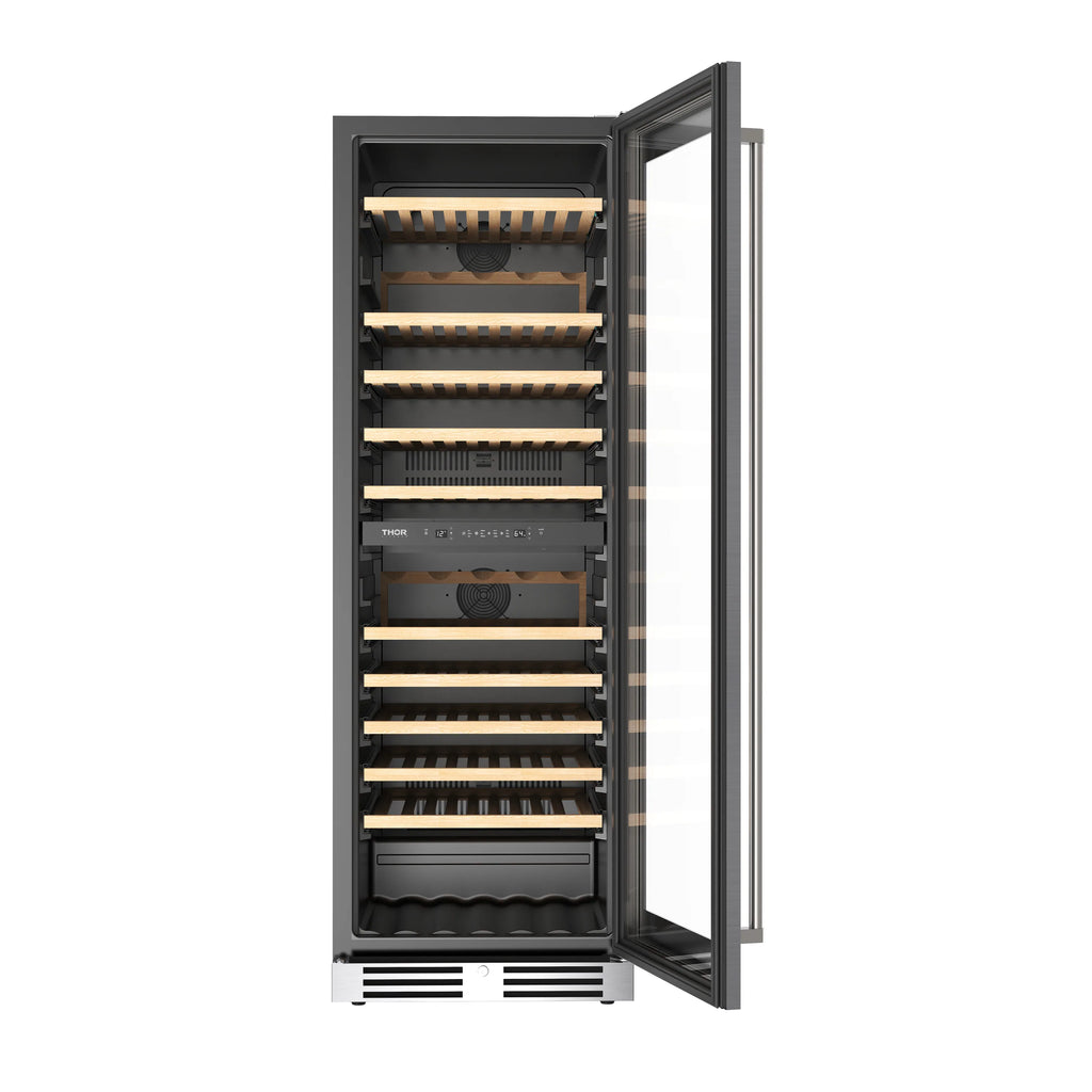 Elevate your wine storage with the Thor Kitchen 24-Inch Freestanding Dual Zone Wine Cooler (TWC2470D). Designed for serious collectors, it offers dual-zone temperature control (5–18°C / 41–64°F) to perfectly preserve red, white, and sparkling wines. With a maximum capacity of up to 115 bottles, it combines ample storage with a sleek display. The intuitive touch control and white LED display ensure precise temperature settings, while a reversible door offers flexible installation. Double pane Low-E glass provides UV protection and insulation, and the frost-free cooling system maintains consistent temperature without ice buildup. Premium beech wood shelves and an angled showcase shelf reduce vibration and highlight your collection beautifully. LED interior lighting with three color options adds a stylish touch to any room.