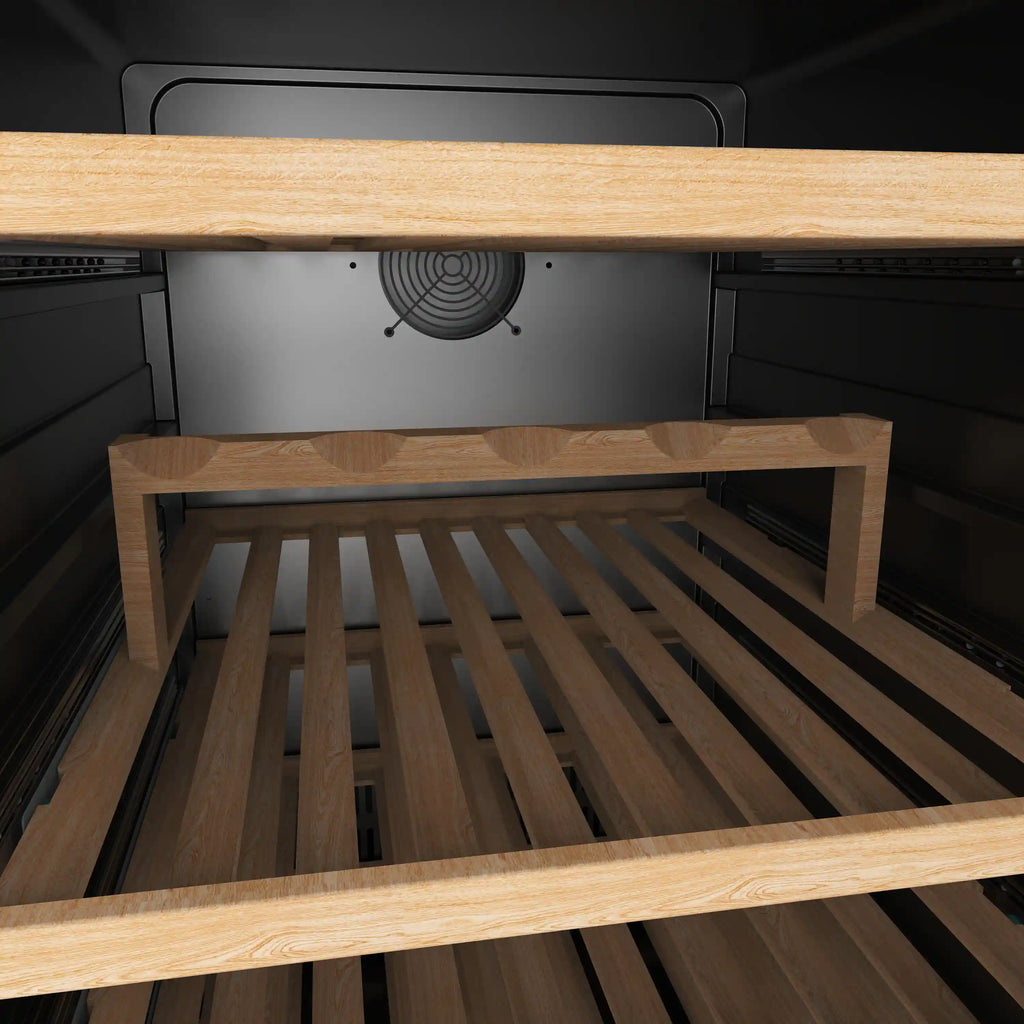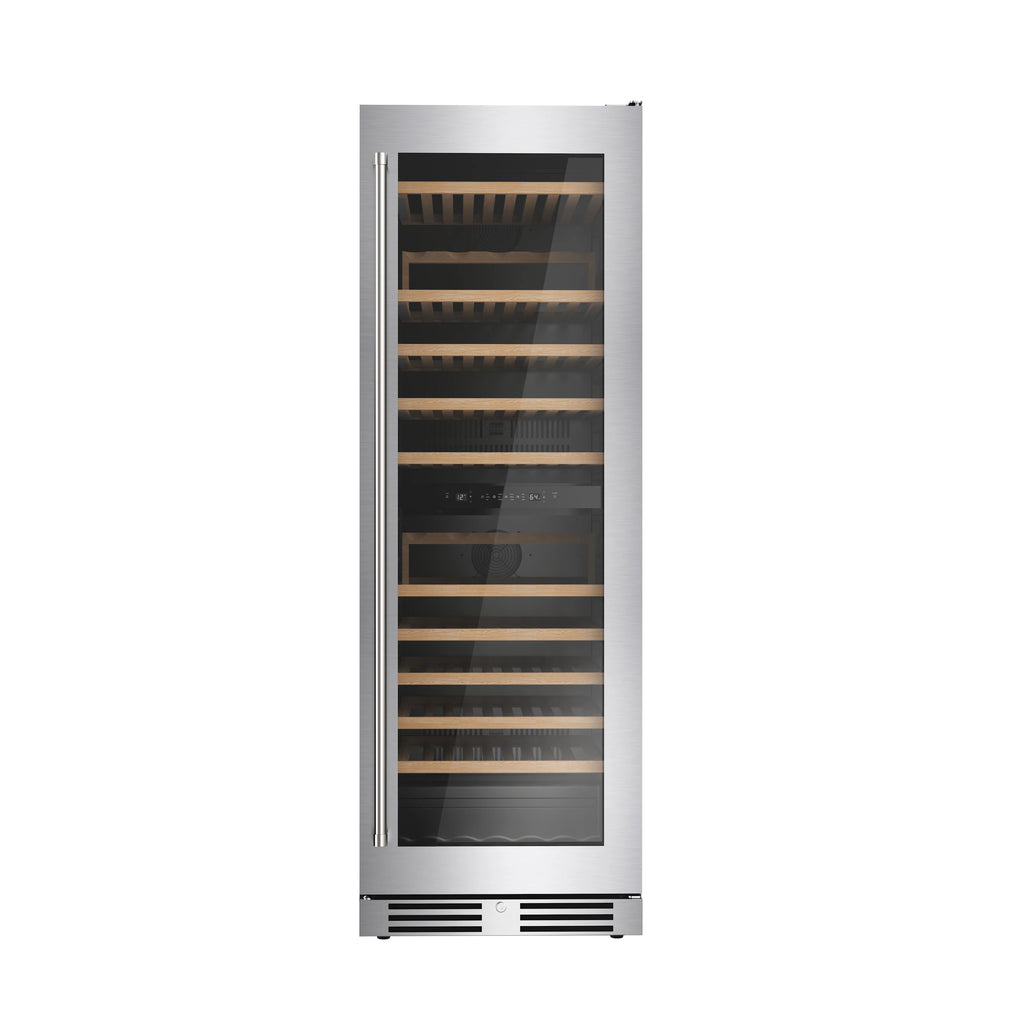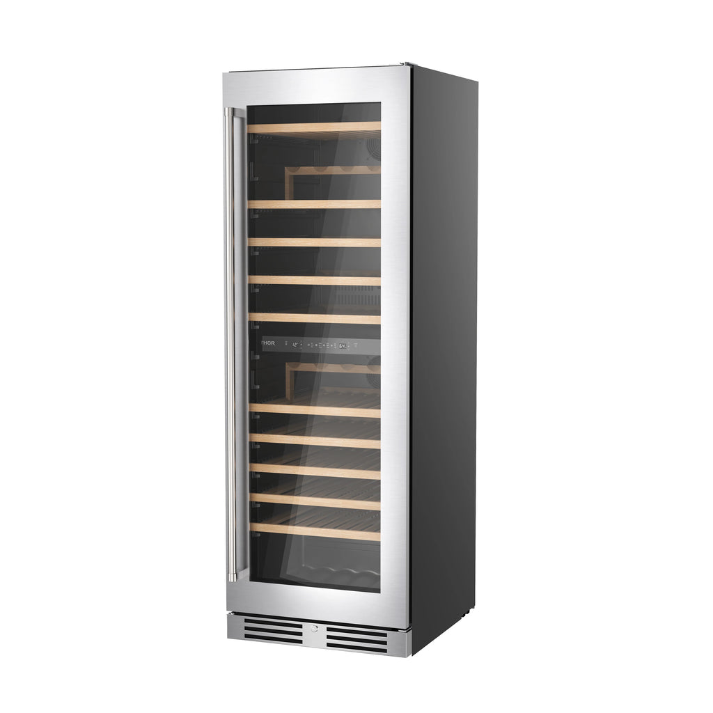 Elevate your wine storage with the Thor Kitchen 24-Inch Freestanding Dual Zone Wine Cooler (TWC2470D). Designed for serious collectors, it offers dual-zone temperature control (5–18°C / 41–64°F) to perfectly preserve red, white, and sparkling wines. With a maximum capacity of up to 115 bottles, it combines ample storage with a sleek display. The intuitive touch control and white LED display ensure precise temperature settings, while a reversible door offers flexible installation. Double pane Low-E glass provides UV protection and insulation, and the frost-free cooling system maintains consistent temperature without ice buildup. Premium beech wood shelves and an angled showcase shelf reduce vibration and highlight your collection beautifully. LED interior lighting with three color options adds a stylish touch to any room.