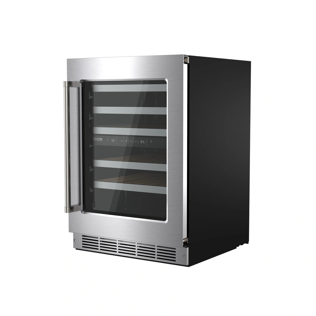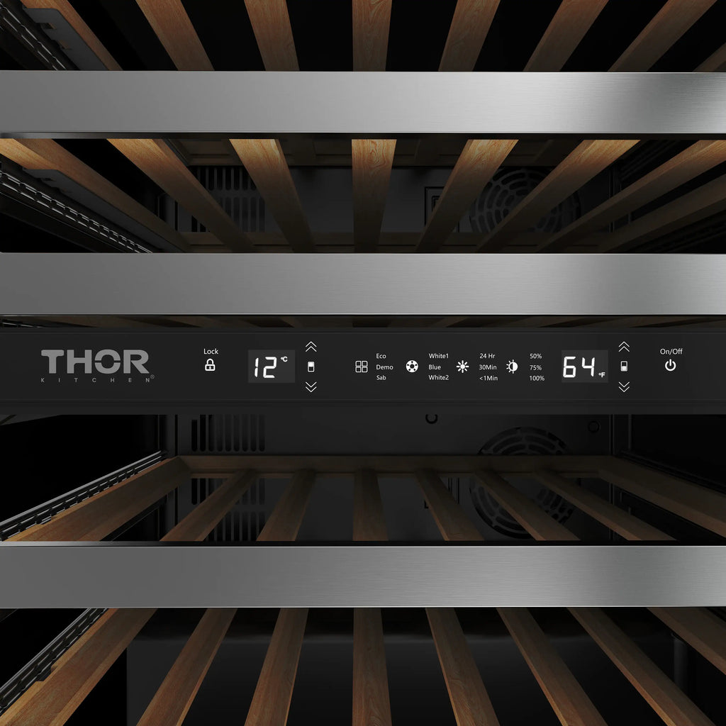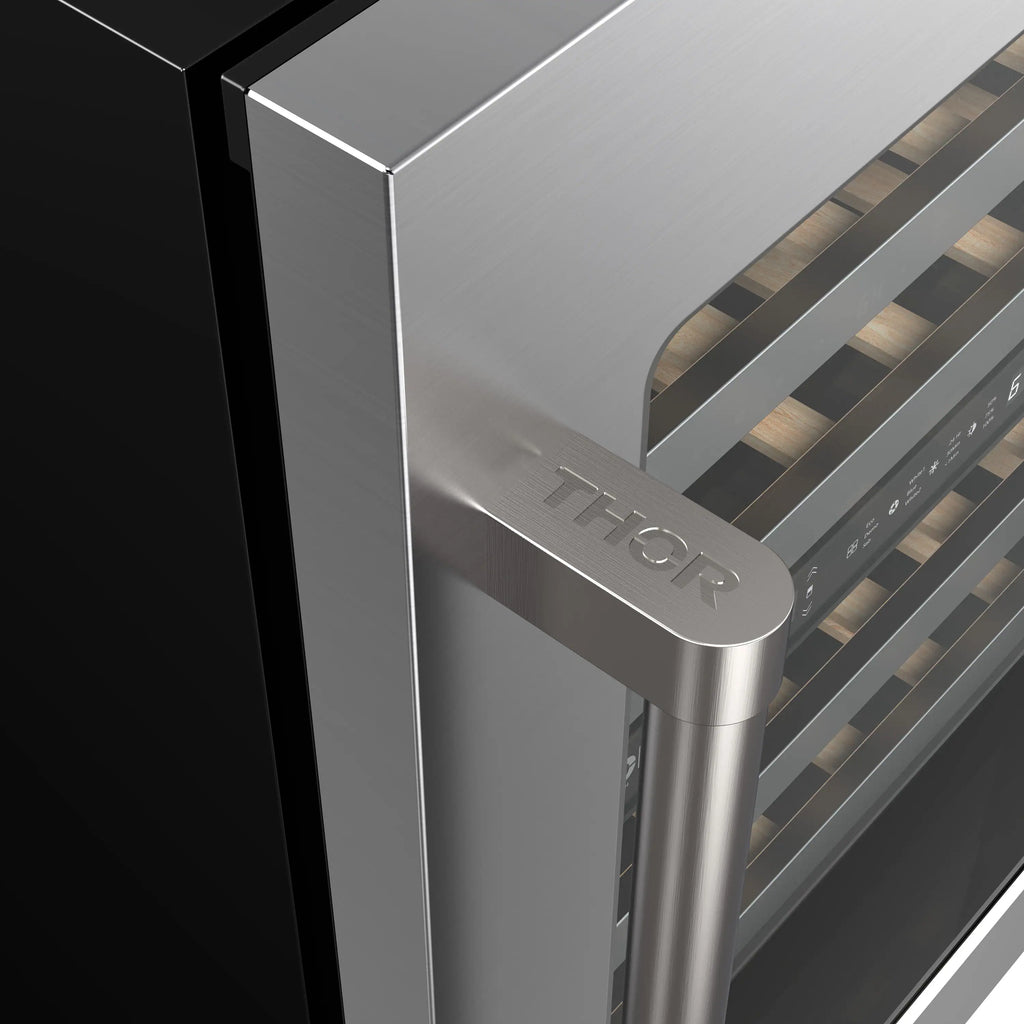 Elevate your wine storage with the Thor Kitchen 30-Inch Undercounter Dual Zone Wine Cooler. Featuring dual-zone temperature control (41–64°F), it perfectly preserves red, white, and sparkling wines. Its 4.9 cu. ft. capacity holds up to 46 bottles, while premium beech wood shelves provide smooth access and flexibility for larger bottles. Designed for both built-in or freestanding use, it includes a reversible door, double pane Low-E glass for insulation and UV protection, and a sleek touch control panel with white LED display. Adjustable LED lighting in three colors adds ambiance, and the hidden hinge ensures a seamless, modern look.