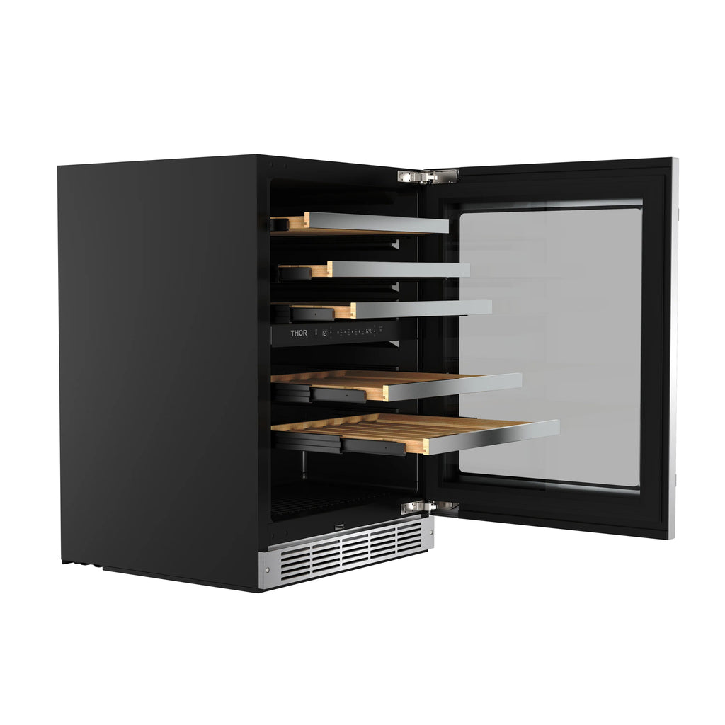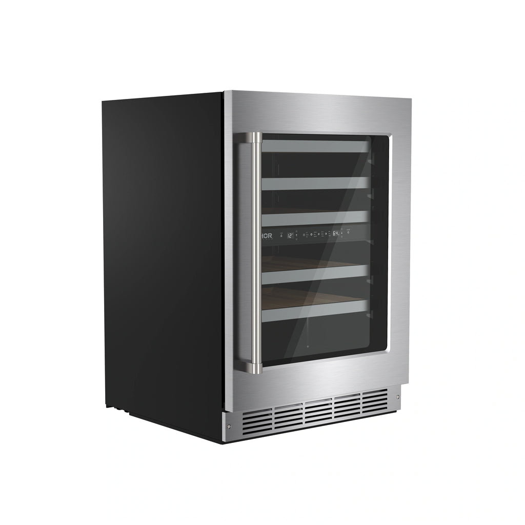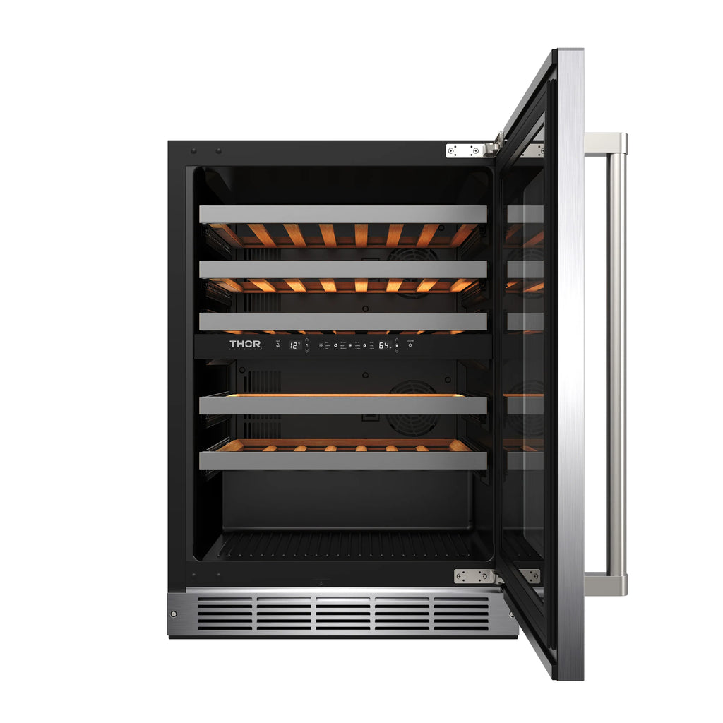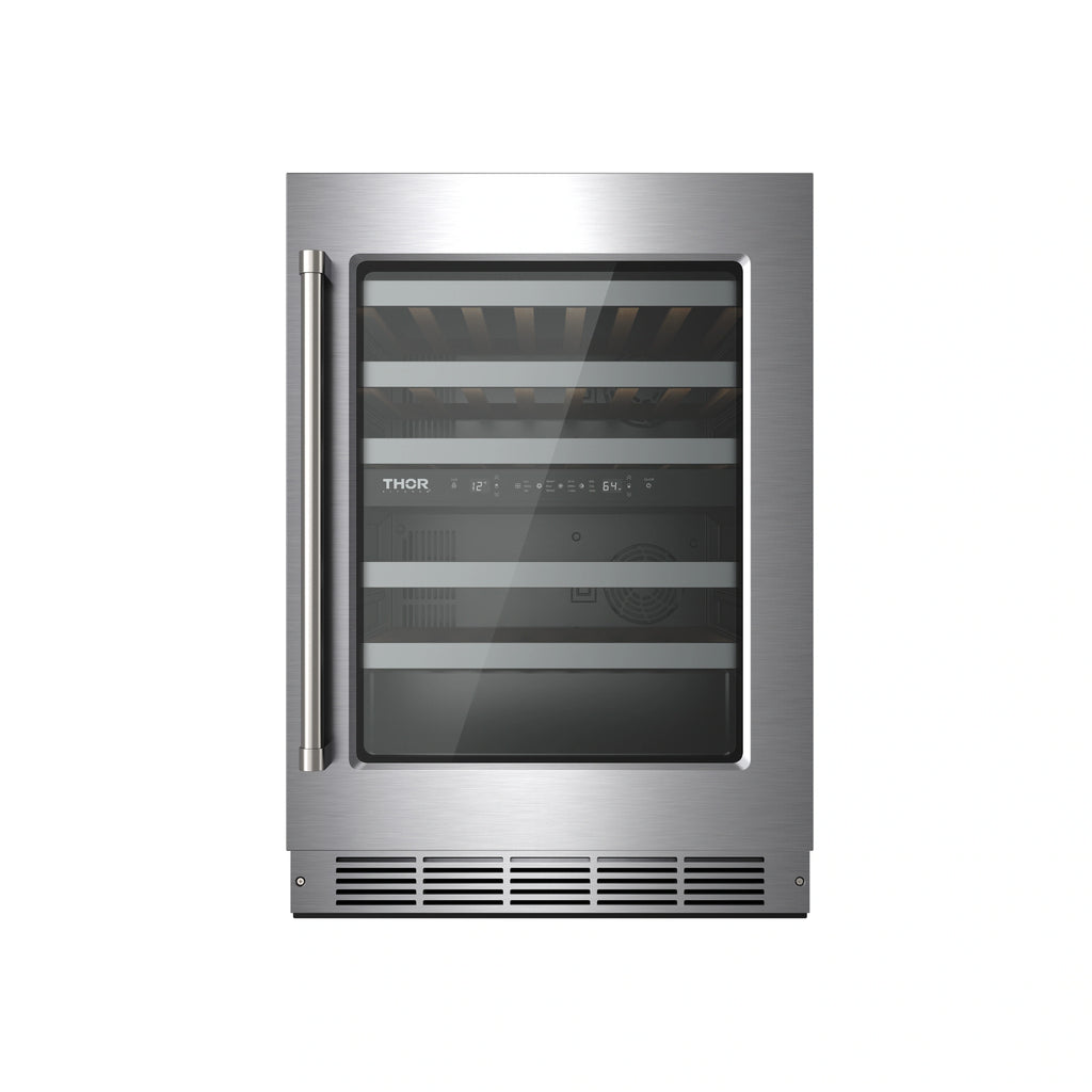 Elevate your wine storage with the Thor Kitchen 30-Inch Undercounter Dual Zone Wine Cooler. Featuring dual-zone temperature control (41–64°F), it perfectly preserves red, white, and sparkling wines. Its 4.9 cu. ft. capacity holds up to 46 bottles, while premium beech wood shelves provide smooth access and flexibility for larger bottles. Designed for both built-in or freestanding use, it includes a reversible door, double pane Low-E glass for insulation and UV protection, and a sleek touch control panel with white LED display. Adjustable LED lighting in three colors adds ambiance, and the hidden hinge ensures a seamless, modern look.