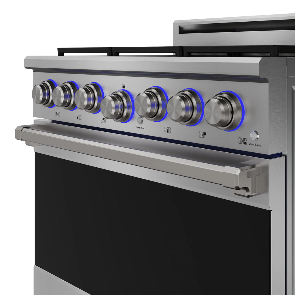 • Blue LED Illuminated Knobs: Sleek, backlit knobs provide a clear visual cue when burners are in use, enhancing safety and modern style—even visible from across the kitchen.