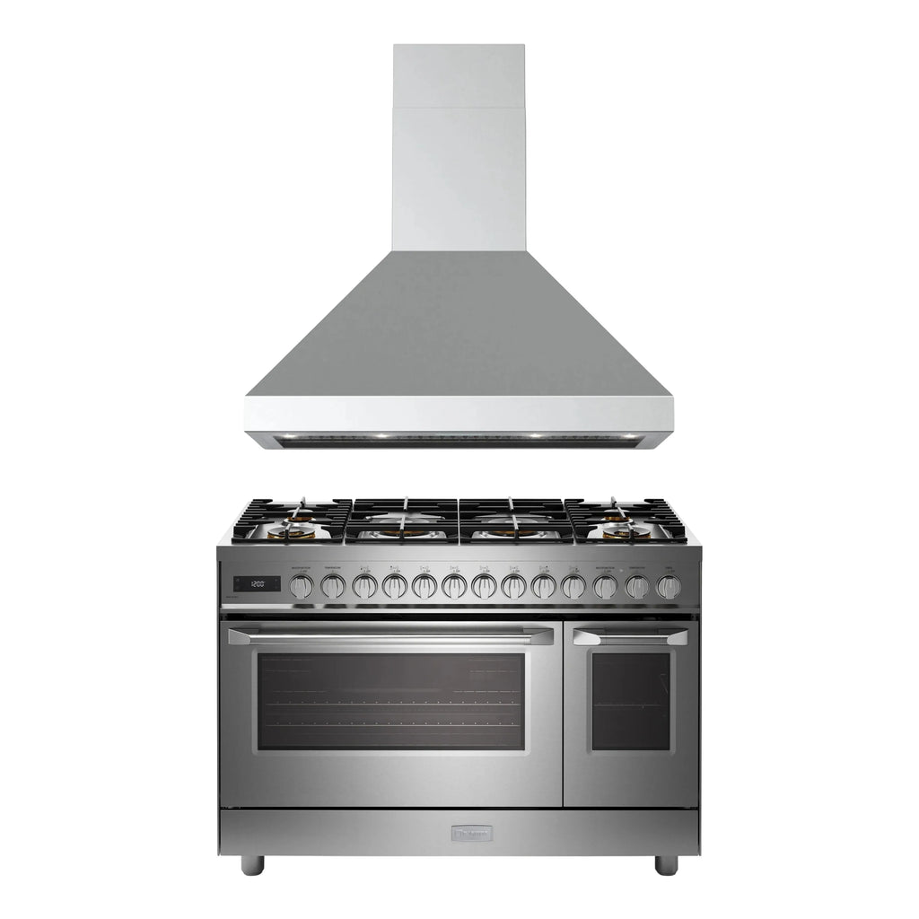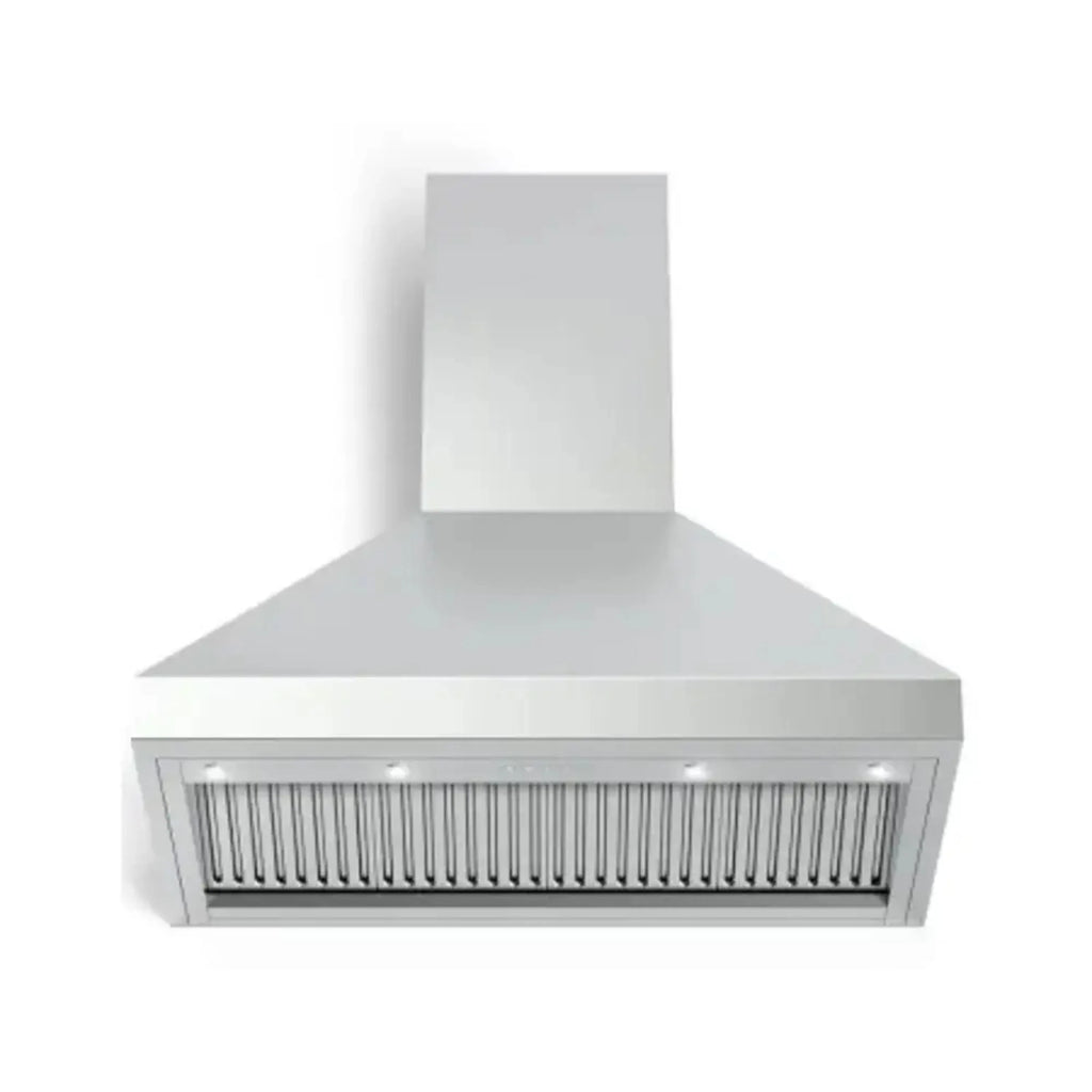 Verona Designer series 48 inch chimney style wall mount range hood in Stainless Steel with a powerful 4-speed, 1,200 CFM ventilation fan. Features telescopic chimney that extends to fit ceilings up to 8 feet, stainless steel baffle filters, and 4 LED lights for a pro-style look.