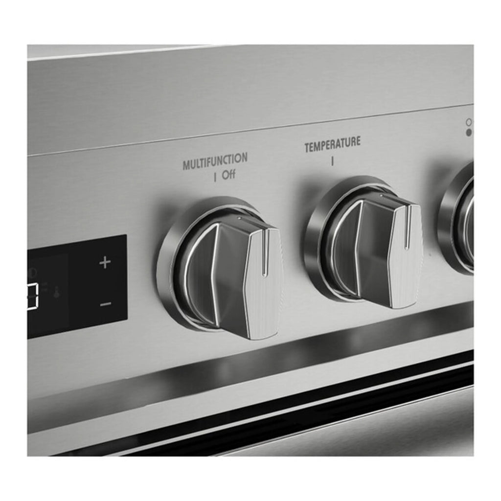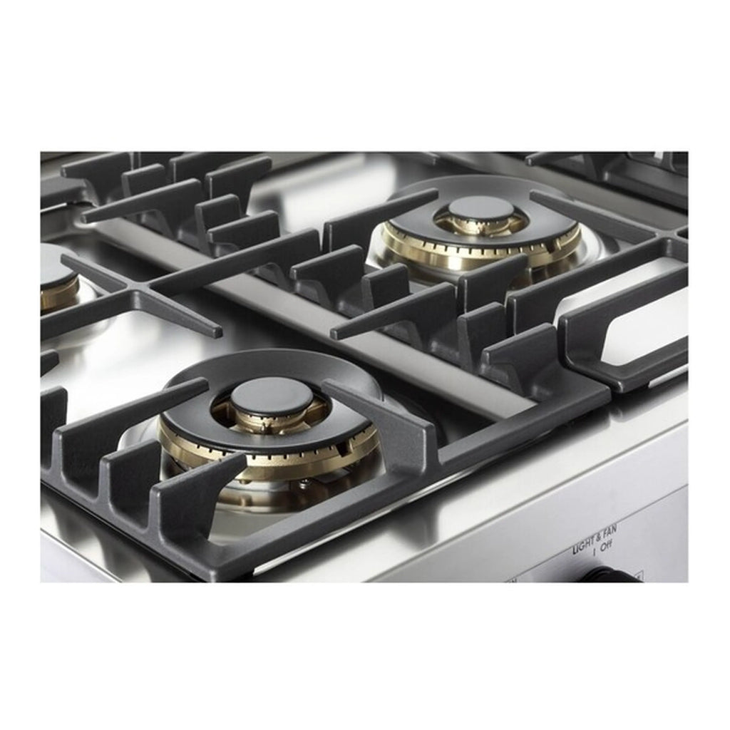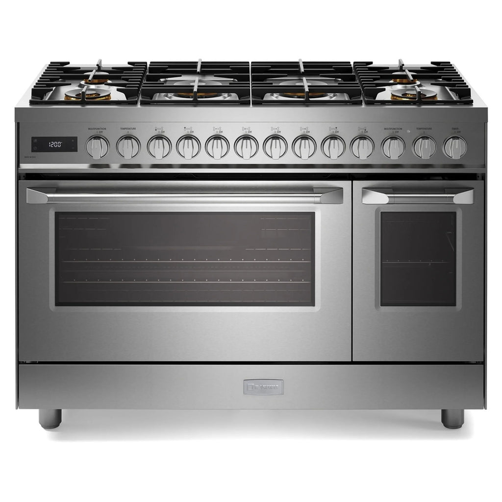 The Verona VUFSGE486DSS 48-inch Ultima Collection dual fuel range in Stainless Steel features six durable brass burners and a spacious 5.8 cu. ft. oven capacity. Includes soft-close hinges, telescopic sliding guides for easy dishware access, and a see-through triple-pane glass door. Made in Italy with the Click&Clean system for easy interior glass removal.
