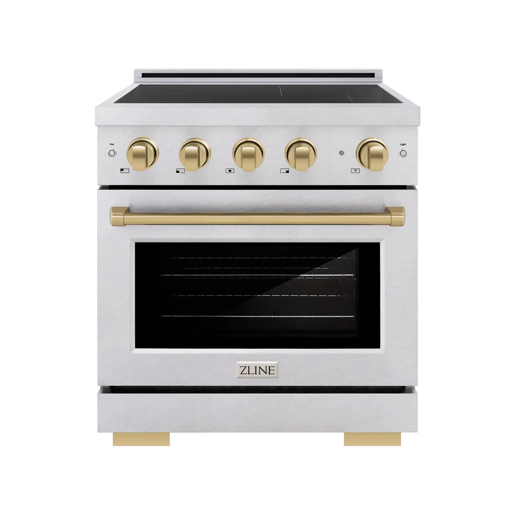 Luxury isn’t meant to be left desired—it’s meant to be attainable. The ZLINE Autograph Edition 30 in. 4.2 cu. ft. Paramount Induction Range with 4 Element Cooktop and Electric Convection Oven in Satin Stainless Steel with Champagne Bronze Accents (SINRSZ-30-CB) combines the versatility of a nanotechnology-reinforced anti-scratch cooktop with anti-glare coating, an electric convection oven with digital thermostat technology, and a Horizon oven door window design allowing you to master every meal. With a modern, timeless style and refined functionality, ZLINE Paramount Induction Ranges are masterfully crafted to deliver an elevated culinary experience.