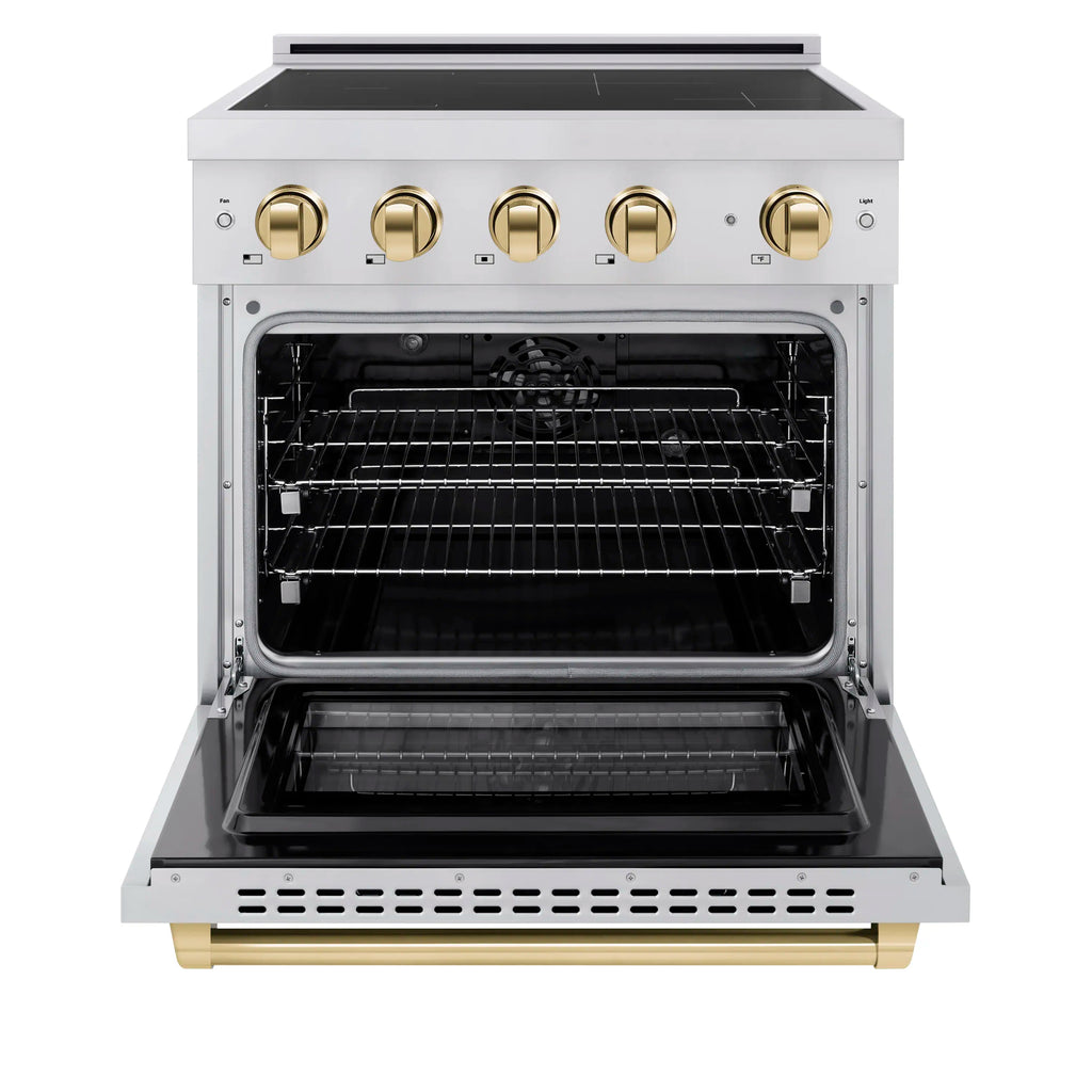 Luxury isn’t meant to be left desired—it’s meant to be attainable. The ZLINE Autograph Edition 30 in. 4.2 cu. ft. Paramount Induction Range with 4 Element Cooktop and Electric Convection Oven in Stainless Steel with Polished Gold Accents (SINRZ-30-G) combines the versatility of a nanotechnology-reinforced anti-scratch cooktop with anti-glare coating, an electric convection oven with digital thermostat technology, and a Horizon oven door window design allowing you to master every meal. With a modern, timeless style and refined functionality, ZLINE Paramount Induction Ranges are masterfully crafted to deliver an elevated culinary experience.