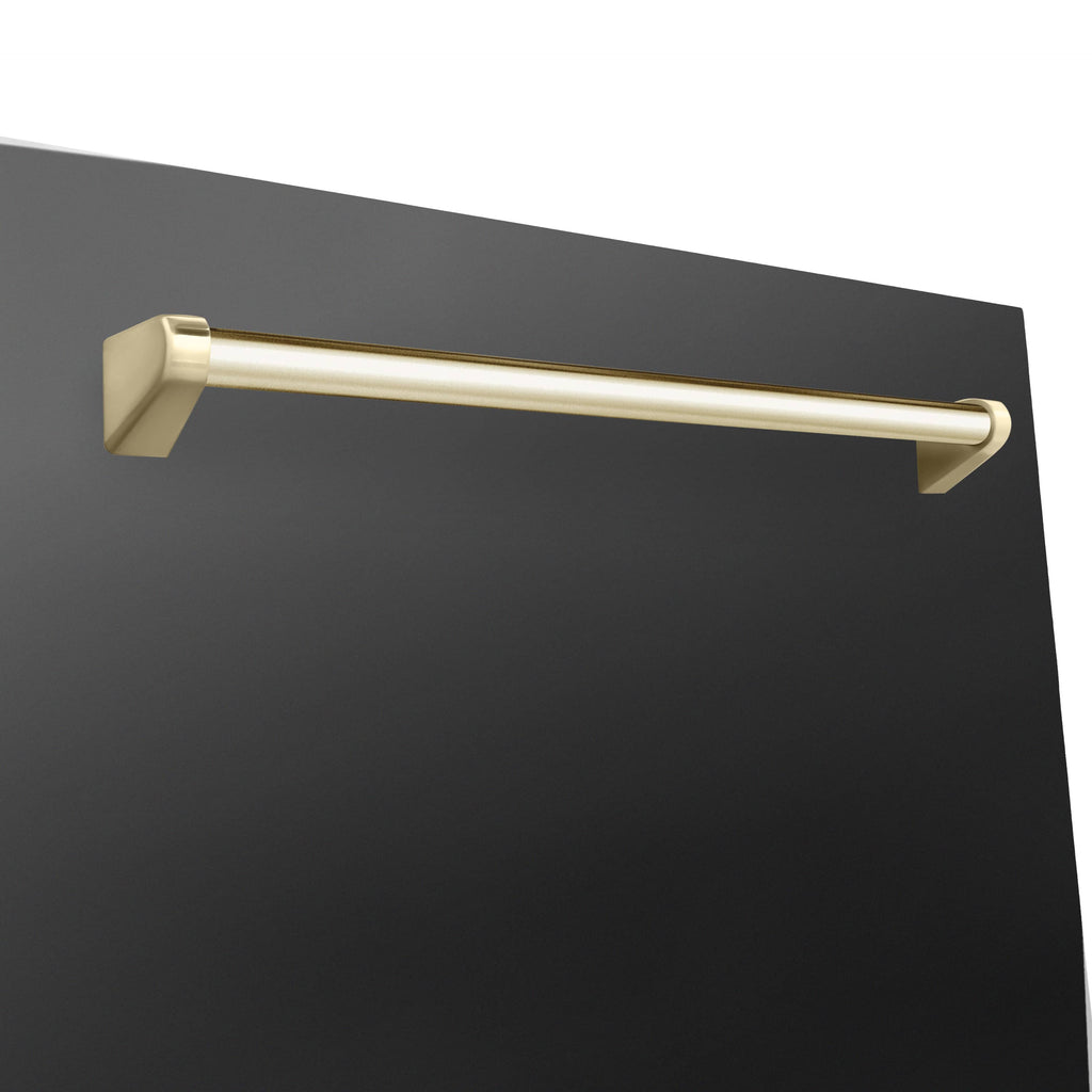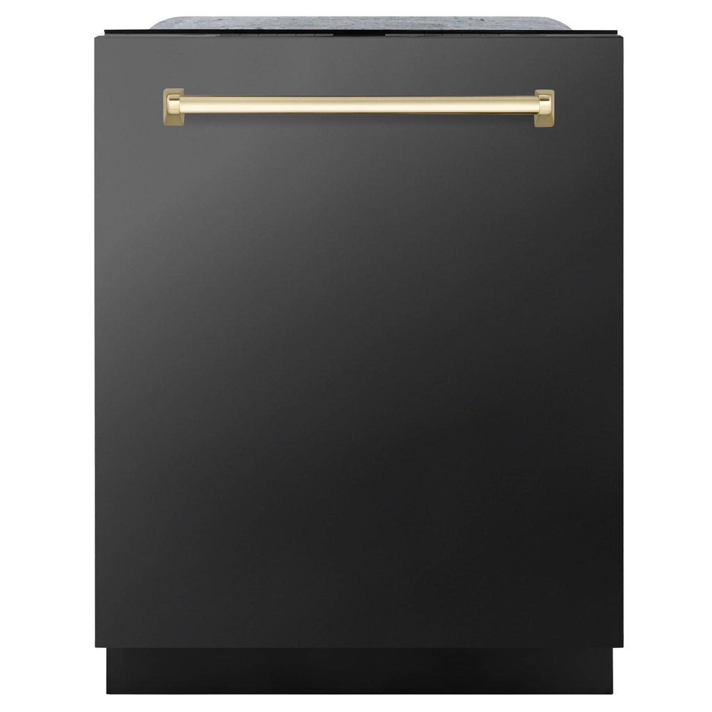 Designed in Lake Tahoe, USA, the ZLINE Autograph Edition 24" 3rd Rack Top Touch Control Tall Tub Dishwasher in Black Stainless Steel with Gold Handle, 45dBa (DWMTZ-BS-24-G) provides a professional culinary experience by pairing unmatched performance with personalized touches.