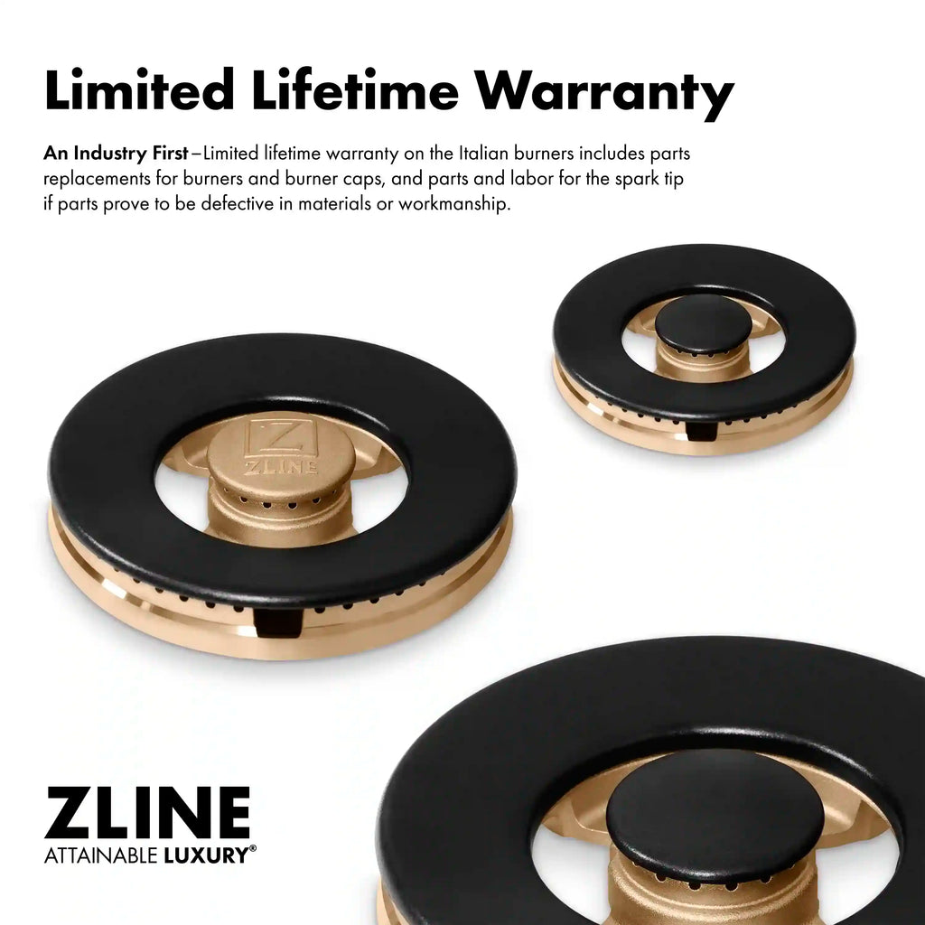 Industry First Lifetime Burner Warranty - Limited lifetime warranty on ZLINE Italian burners includes part replacements for burners and burner caps, and parts and labor for spark tips if parts prove to be defective in materials or workmanship