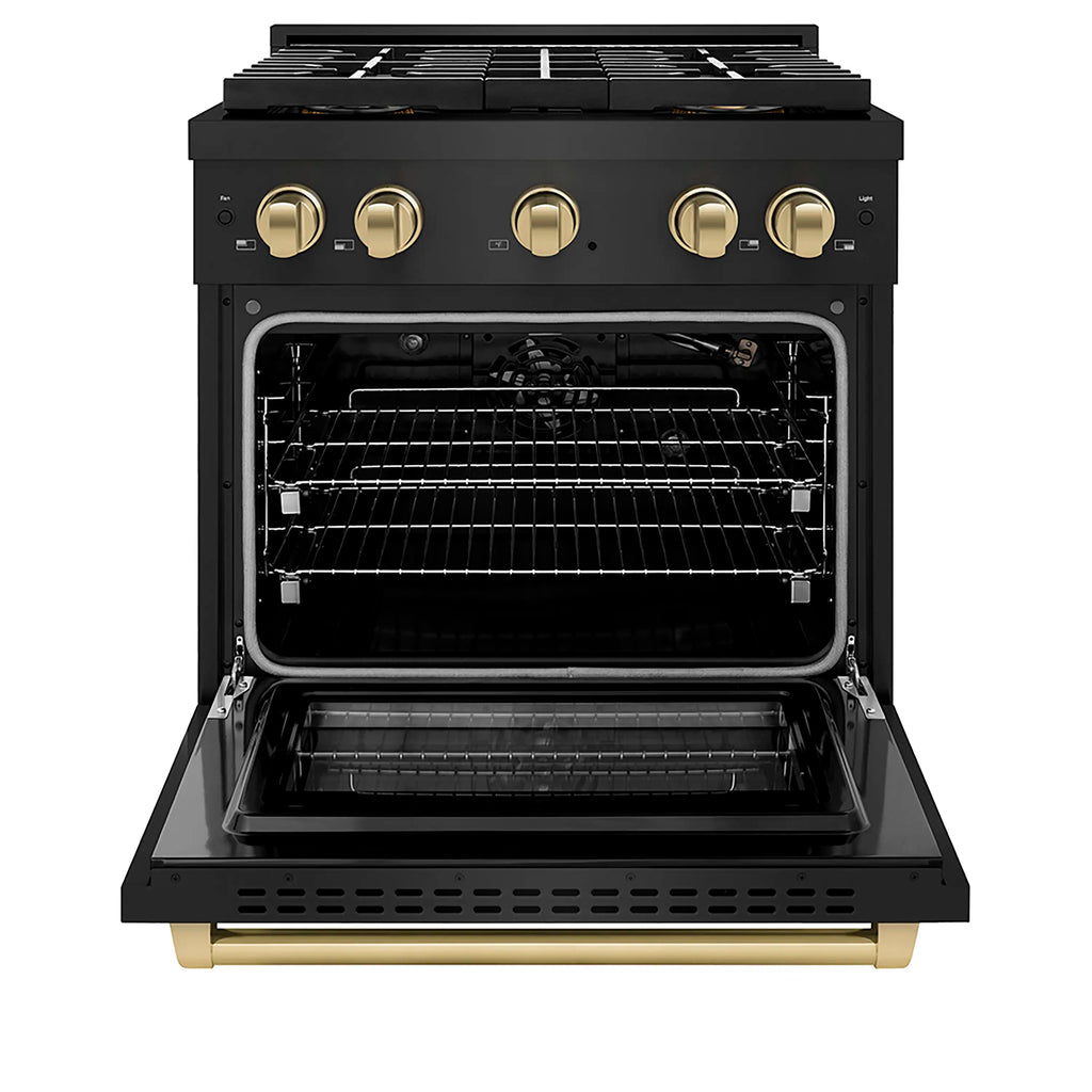 Luxury isn’t meant to be left desired—it’s meant to be attainable. The ZLINE Autograph Edition 30 in. 4.2 cu. ft. Paramount Gas Range with 4 Burner DuoPro™ Cooktop and Convection Gas Oven in Black Stainless Steel and Champagne Bronze Accents (PSGRBZ-30-CB) features a high-powered gas cooktop with 4 hand-crafted Italian dual-ring brass burners and a versatile gas convection oven allowing you to master every meal. Double your cooking power on every burner with a DuoPro™ Cooktop that delivers ultimate flame control flexibility and unprecedented culinary confidence.