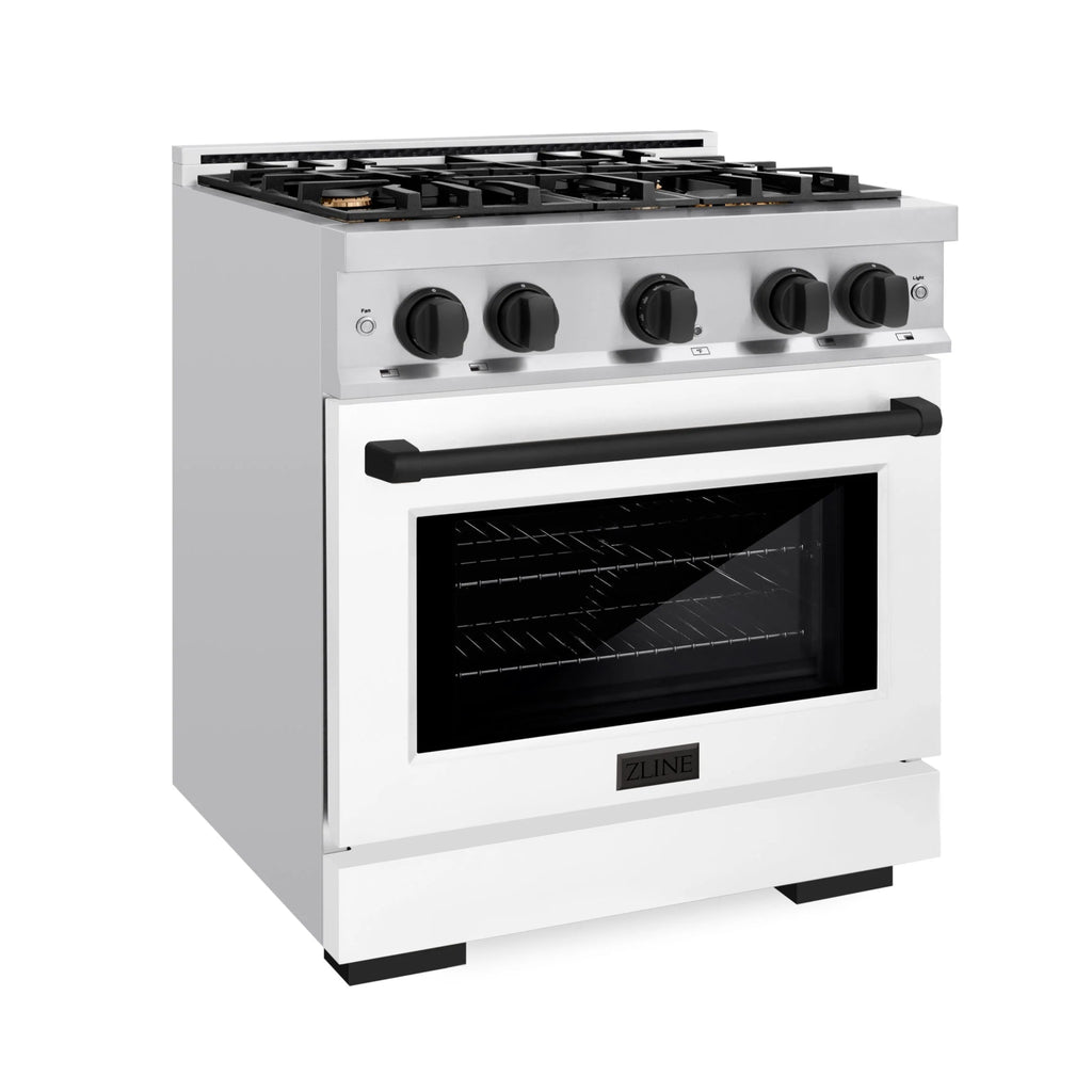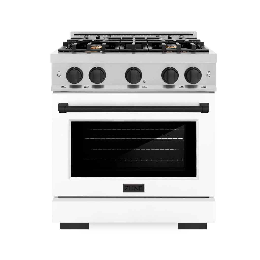 Luxury isn’t meant to be desired - it’s meant to be attainable. The ZLINE Autograph Edition 30 in. 4.2 cu. ft. Select Gas Range with 4 Burner Cooktop and Convection Gas Oven in Stainless Steel with White Matte Door and Matte Black Accents (HGRZ-WM-30-MB) combines the elegance of a hand-finished porcelain gas cooktop with 4 Italian-made auto-reignition burners, a gas convection oven with an energy-efficient cooling fan to ensure quiet operation, a beautiful white matte door with a Horizon window design, and stunning matte black knobs and handle allowing you to master every meal. With a modern, timeless style and refined functionality, ZLINE Select Gas Ranges are masterfully crafted to deliver an elevated culinary experience.