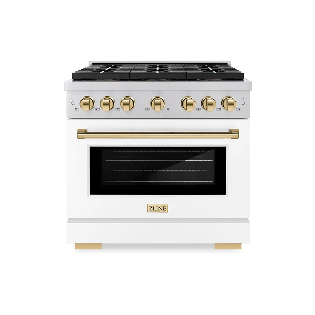 Luxury isn’t meant to be left desired—it’s meant to be attainable. The ZLINE Autograph Edition 36 in. 5.2 cu. ft. Paramount Dual Fuel Range with 6 Burner DuoPro™ Cooktop and Electric Convection Oven with White Matte Door and Polished Gold Accents (PSDRZ-WM-36-G) features a high-powered gas cooktop with 6 hand-crafted Italian dual-ring brass burners and a versatile electric convection oven allowing you to master every meal. Double your cooking power on every burner with a DuoPro™ Cooktop that delivers ultimate flame control flexibility and unprecedented culinary confidence.
