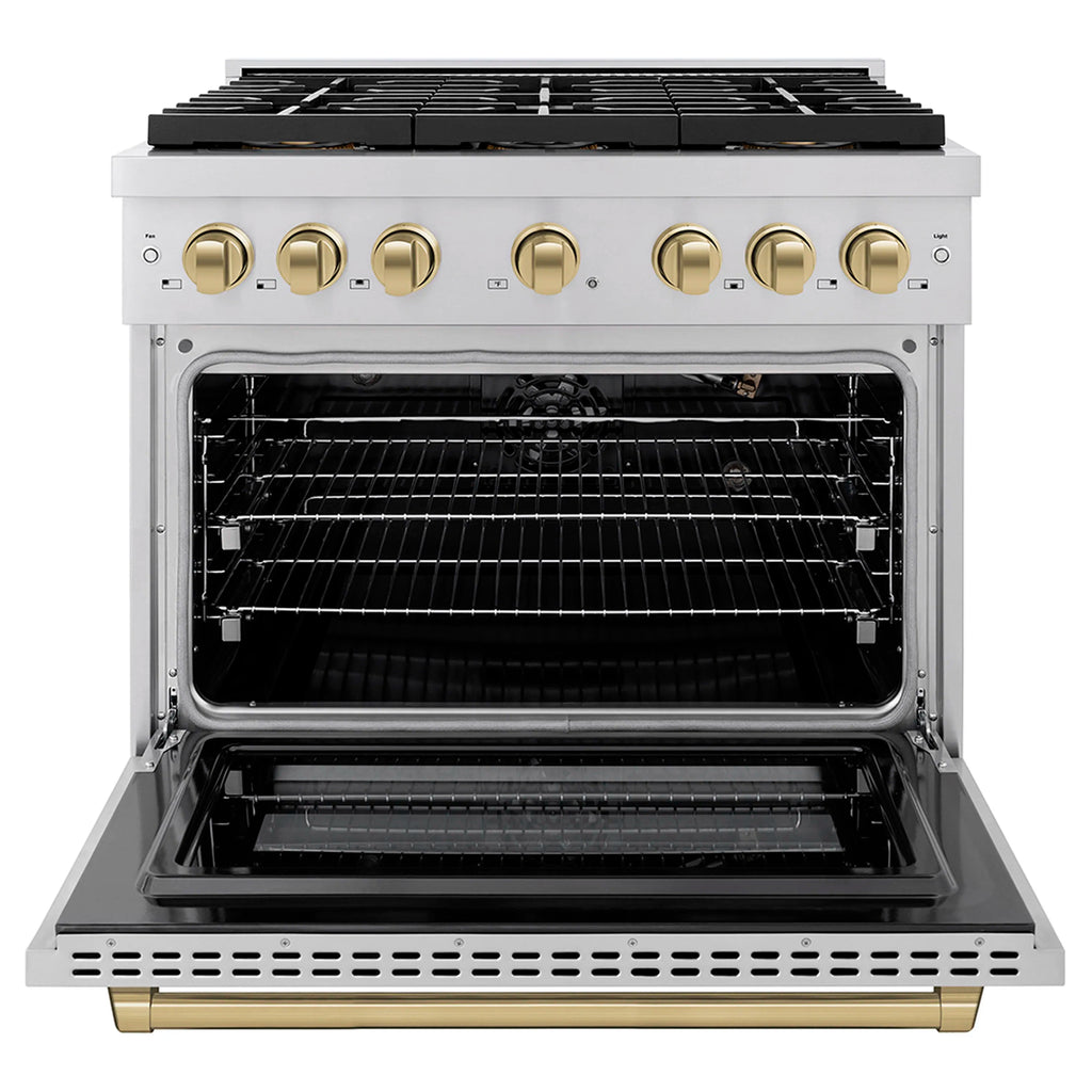 Luxury isn’t meant to be left desired—it’s meant to be attainable. The ZLINE Autograph Edition 36 in. 5.2 cu. ft. Paramount Gas Range with 6 Burner DuoPro™ Cooktop and Convection Gas Oven in Stainless Steel and Champagne Bronze Accents (PSGRZ-36-CB) features a high-powered gas cooktop with 6 hand-crafted Italian dual-ring brass burners and a versatile gas convection oven allowing you to master every meal. Double your cooking power on every burner with a DuoPro™ Cooktop that delivers ultimate flame control flexibility and unprecedented culinary confidence.