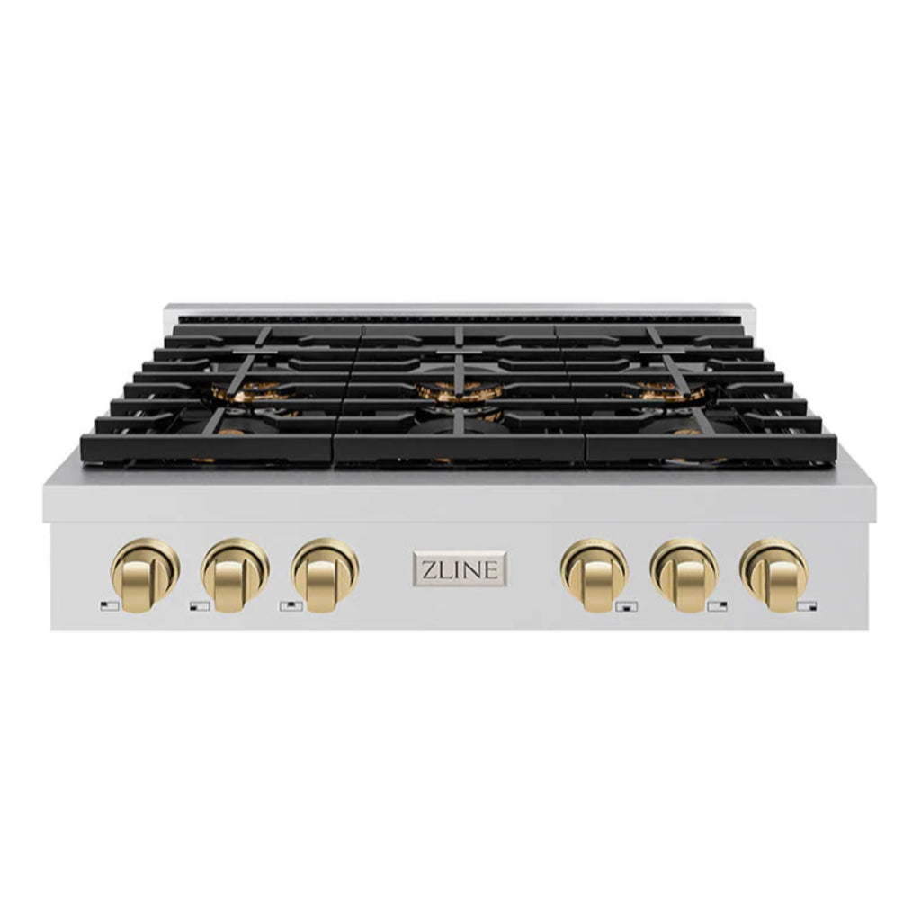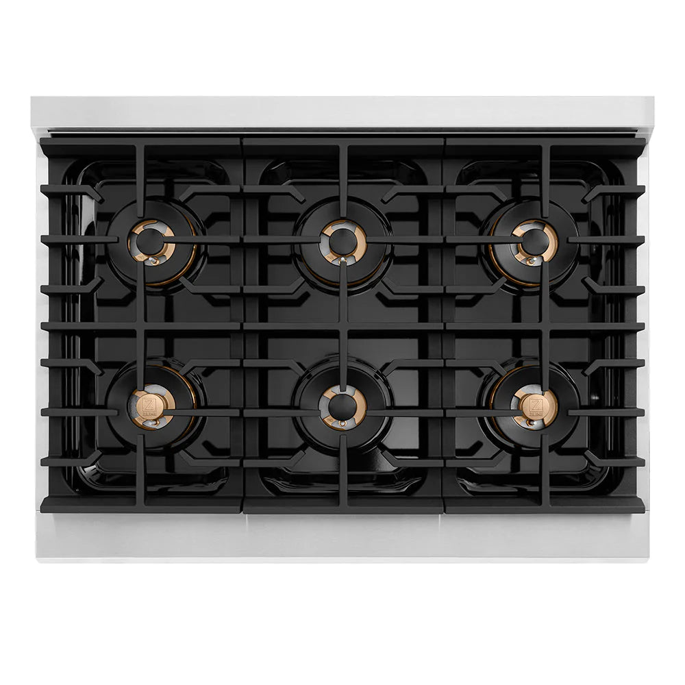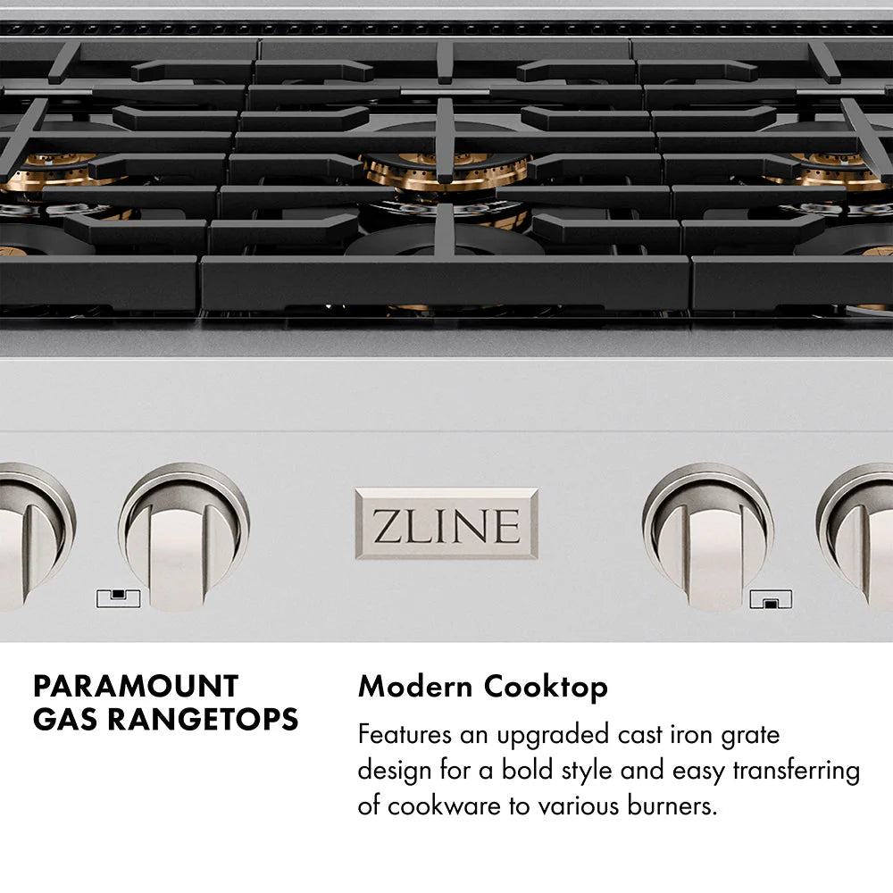 Luxury isn’t meant to be left desired—it’s meant to be attainable. The ZLINE Autograph Edition 36 in. Paramount Gas Rangetop with 6 Burner DuoPro™ Cooktop in Stainless Steel and Champagne Bronze Accents (PSRTZ-36-CB) features a high-powered gas cooktop with 6 hand-crafted Italian dual-ring brass burners and an expansive one-piece porcelain cooktop allowing you to master every meal. Double your cooking power on every burner with a DuoPro™ Cooktop that delivers ultimate flame control flexibility and unprecedented culinary confidence.