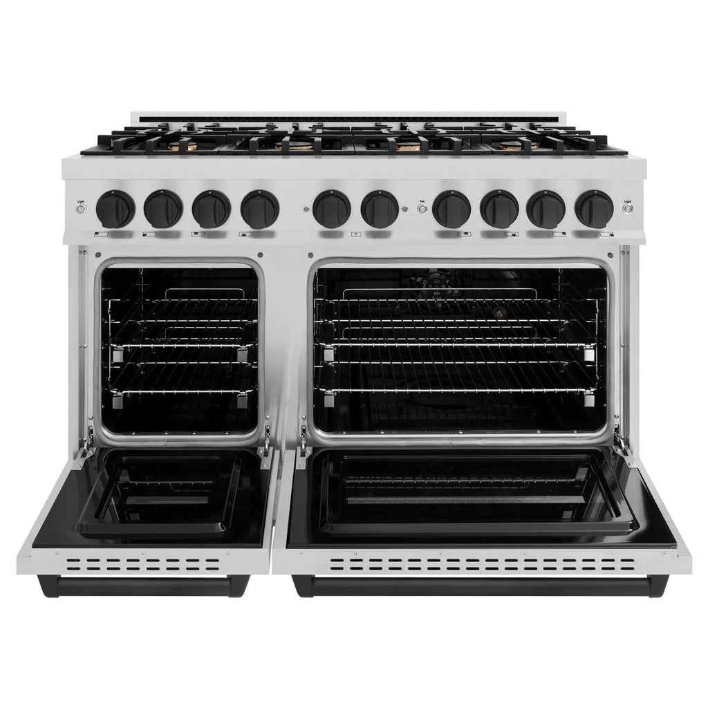 Luxury isn’t meant to be desired - it’s meant to be attainable. The ZLINE Autograph Edition 48 in. 6.7 cu. ft. Classic Double Oven Gas Range with 8 Burner Cooktop in Stainless Steel and Matte Black Accents (CGRZ-48-MB) combines the elegance of a hand-finished porcelain gas cooktop with 8 Italian-made auto-reignition burners, a large gas convection oven with an energy-efficient cooling fan to ensure quiet operation, a small baking oven, Landscape oven door window designs, and stunning matte black knobs and handles allowing you to master every meal. With a modern, timeless style and refined functionality, ZLINE Classic Gas Ranges are masterfully crafted to deliver an elevated culinary experience.
