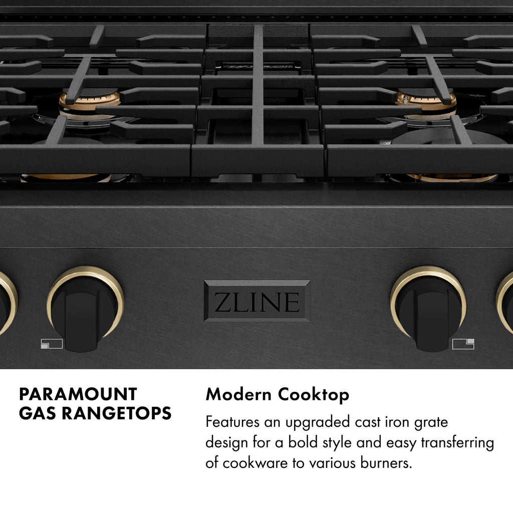 Luxury isn’t meant to be left desired—it’s meant to be attainable. The ZLINE Designer Collection 30 in. Paramount Gas Rangetop with 4 Burners in Black Satin Stainless Steel with Matte Black and Champagne Bronze Accents (SRTBSZ-30-MBCB) features 4 Italian-made auto-reignition burners and an expansive one-piece porcelain cooktop allowing you to master every meal and deliver an elevated culinary experience.