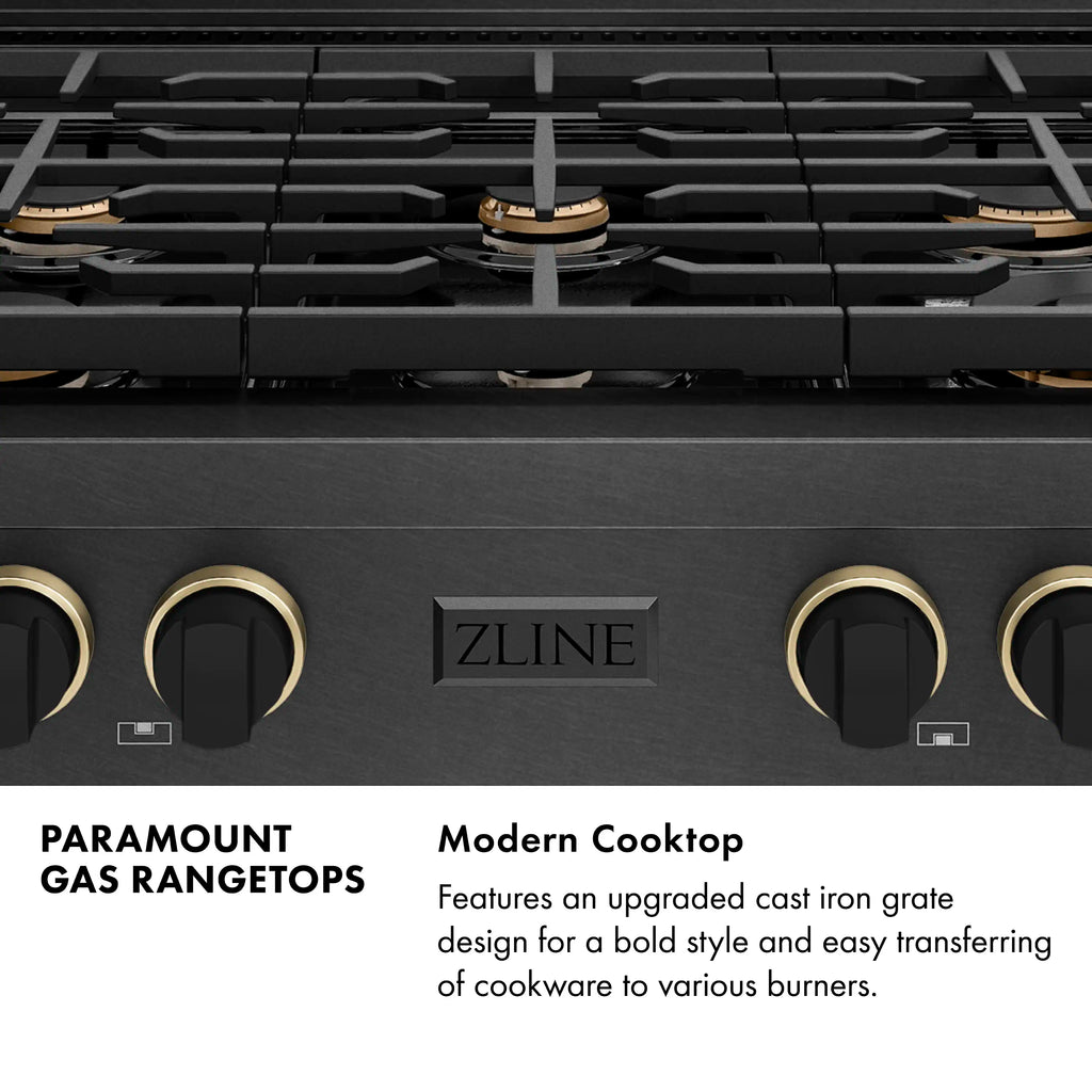 Luxury isn’t meant to be left desired—it’s meant to be attainable. The ZLINE Designer Collection 36 in. Paramount Gas Rangetop with 6 Burners in Black Satin Stainless Steel with Matte Black and Champagne Bronze Accents (SRTBSZ-36-MBCB) features 6 Italian-made auto-reignition burners and an expansive one-piece porcelain cooktop allowing you to master every meal and deliver an elevated culinary experience.